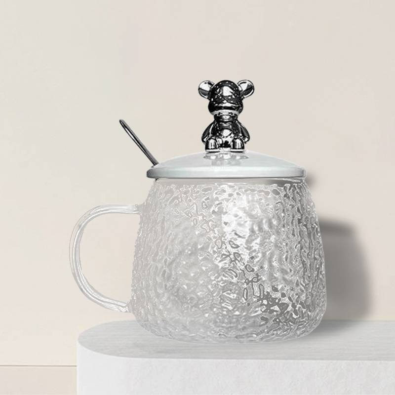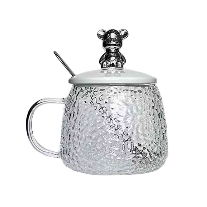 ins锤纹小熊杯可爱耐热玻璃水杯颜值带盖勺公室家用早餐杯小熊杯
