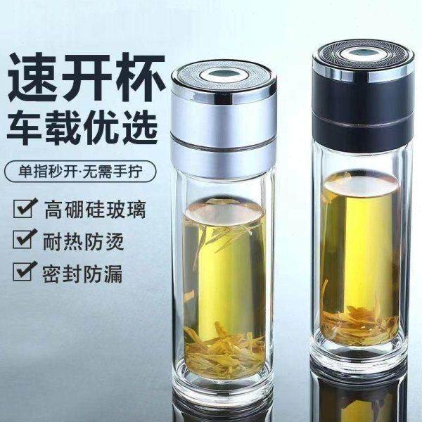 一键开盖车载玻璃杯速开启双层水杯防摔不烂 茶水分离茶杯男专用