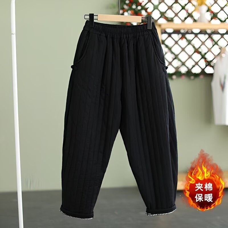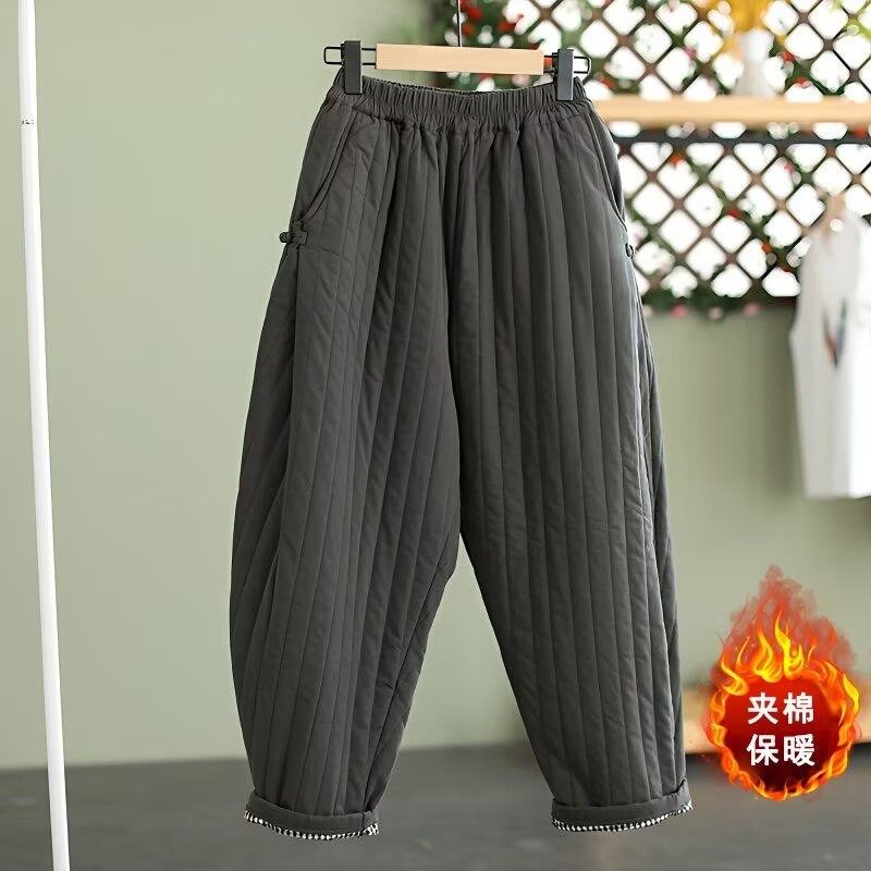 胖mm松紧腰盘扣休闲显瘦萝卜裤 女装 子大码 夹棉压线竖纹纯色保暖裤