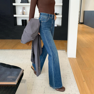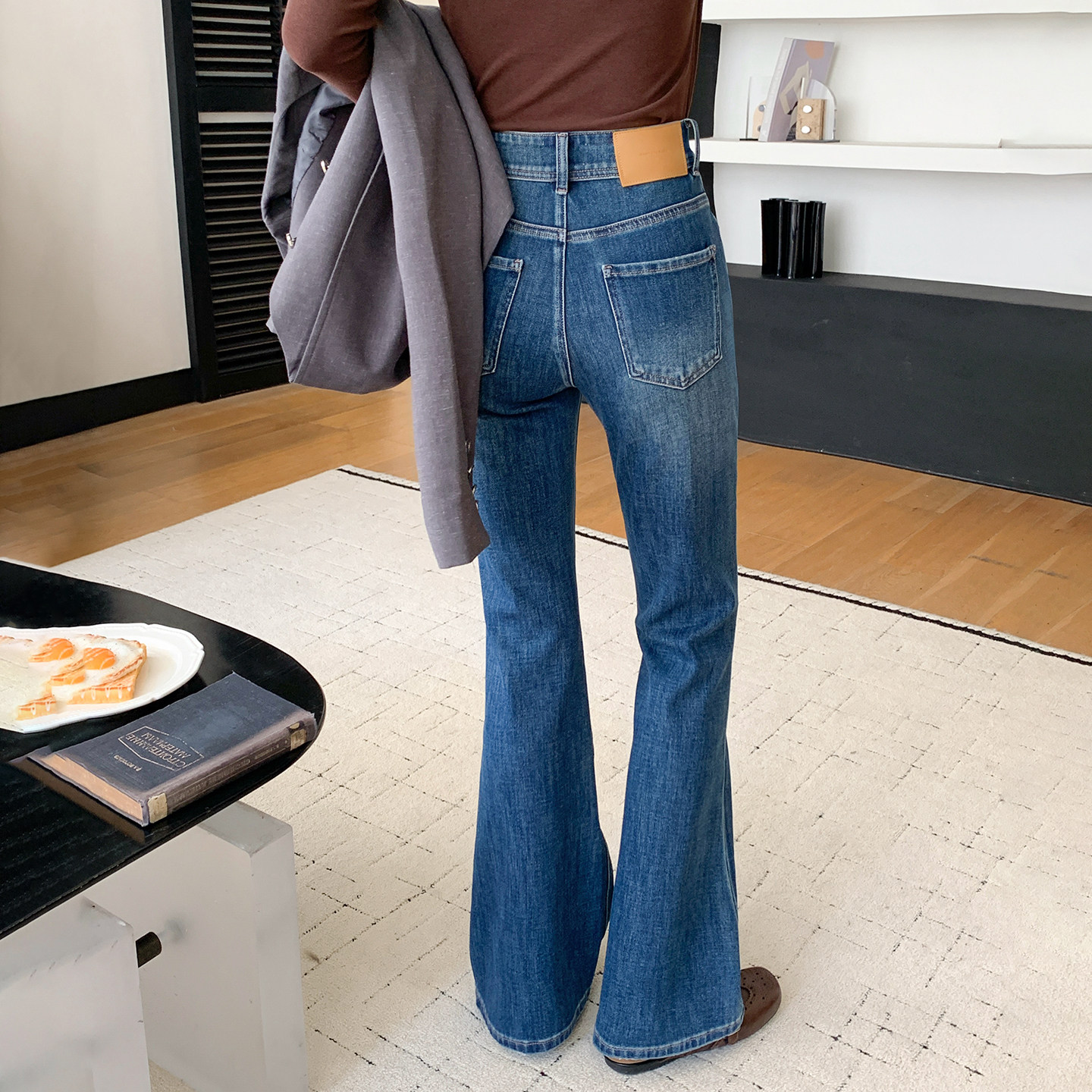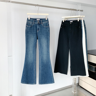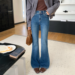 加厚高腰两粒扣蓝色喇叭裤 CKLY2706斯卡洛依加绒微喇牛仔裤 女冬季