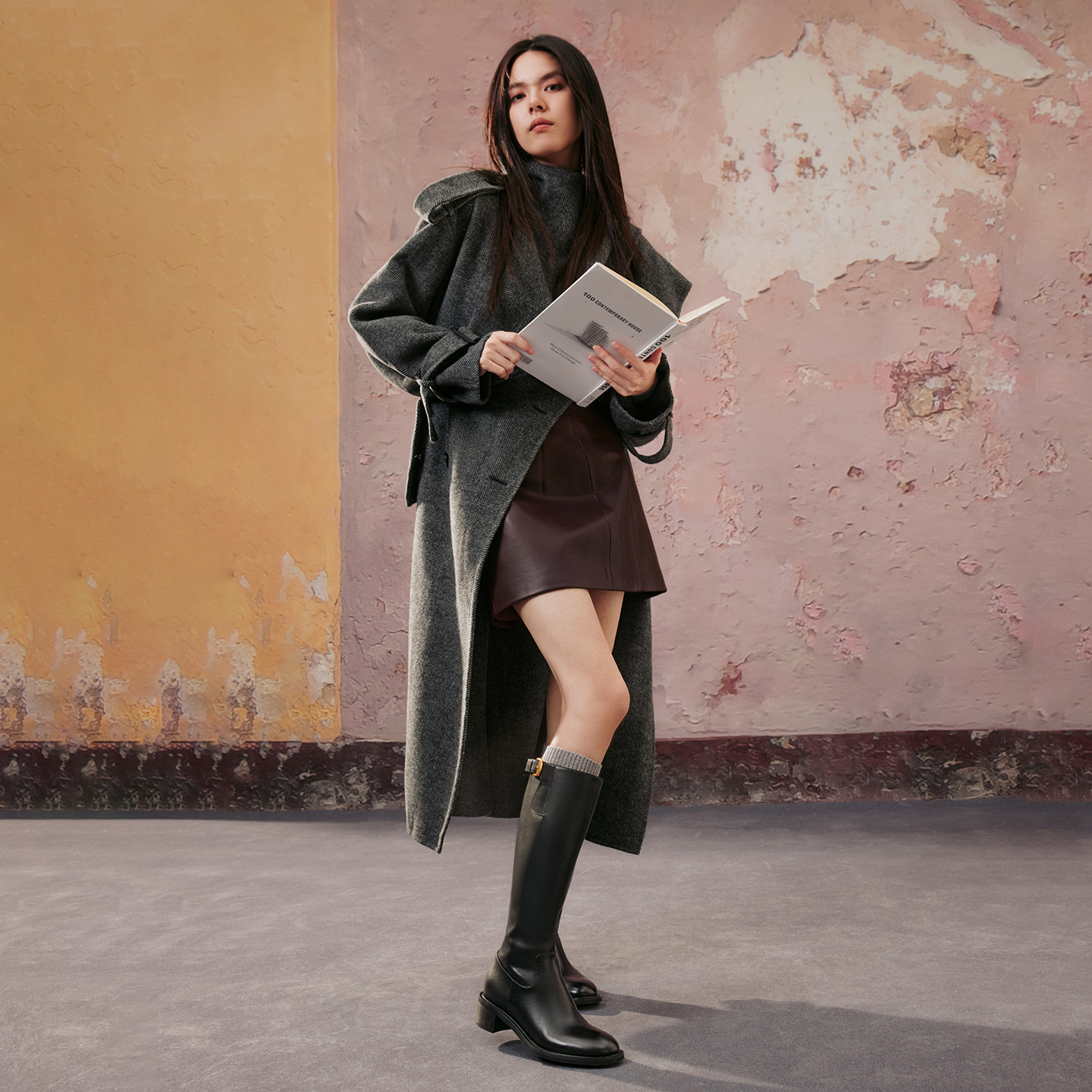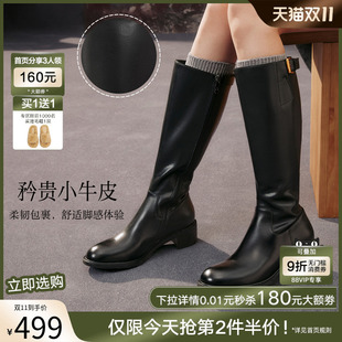百思图25冬新款 牛皮圆头粗跟骑士靴通勤女大筒围高筒长靴AX891DG5