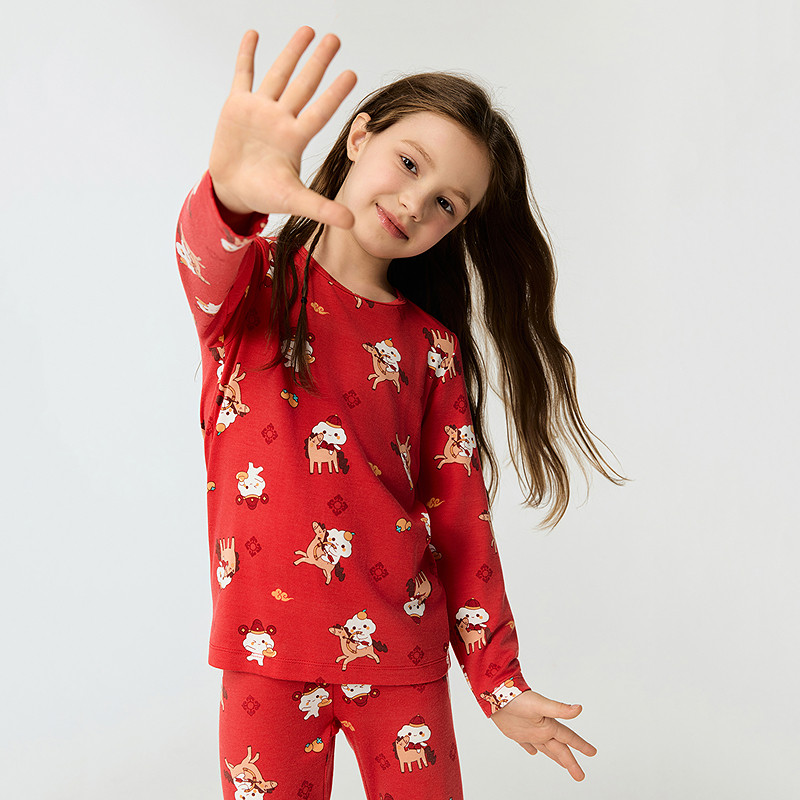 爱慕儿童男女孩保暖套装 奶皮衣新年红本命年生肖马3A抗菌 秋衣秋裤