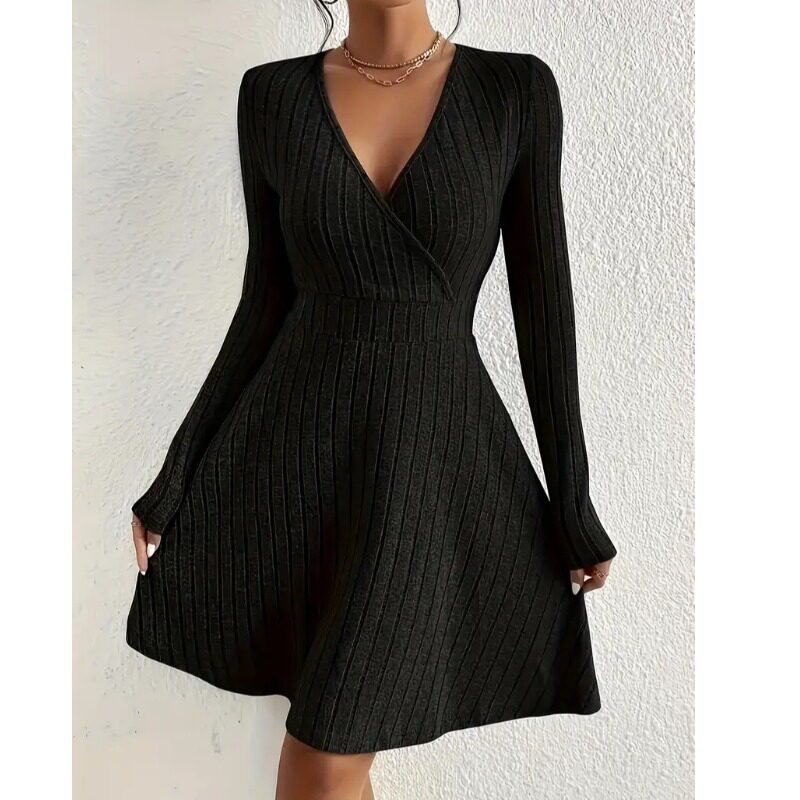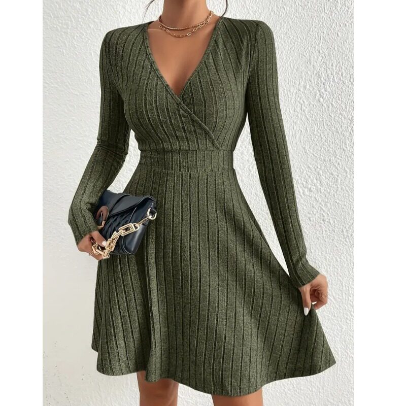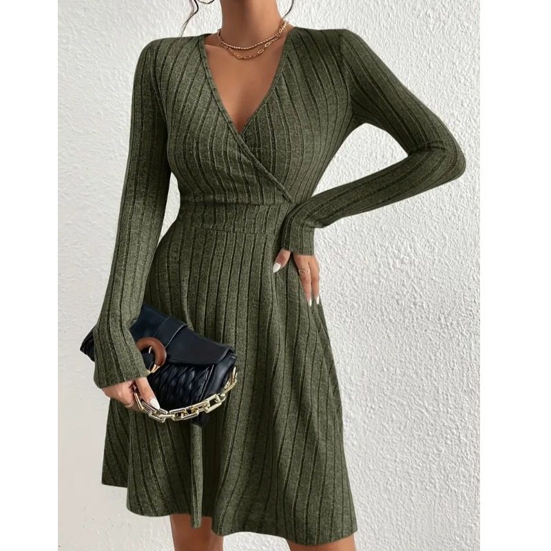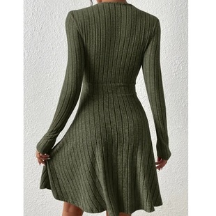 秋冬新款 连衣裙中裙打底DRESS 欧美性感v领收腰军绿色坑条磨毛长袖
