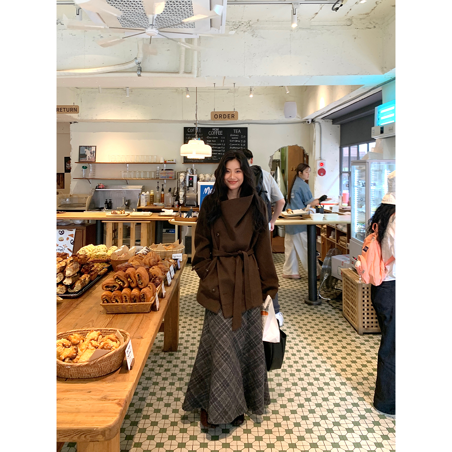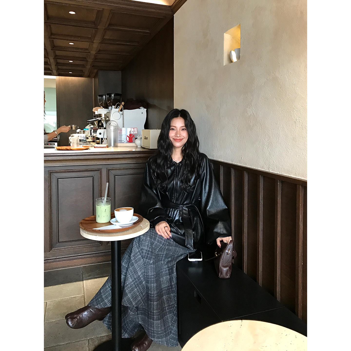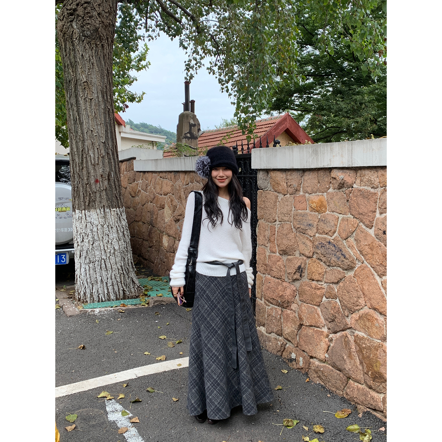 DaqianwithU 灰色高腰显瘦呢子格纹半身裙女秋冬通勤加厚直筒长裙