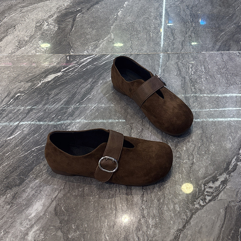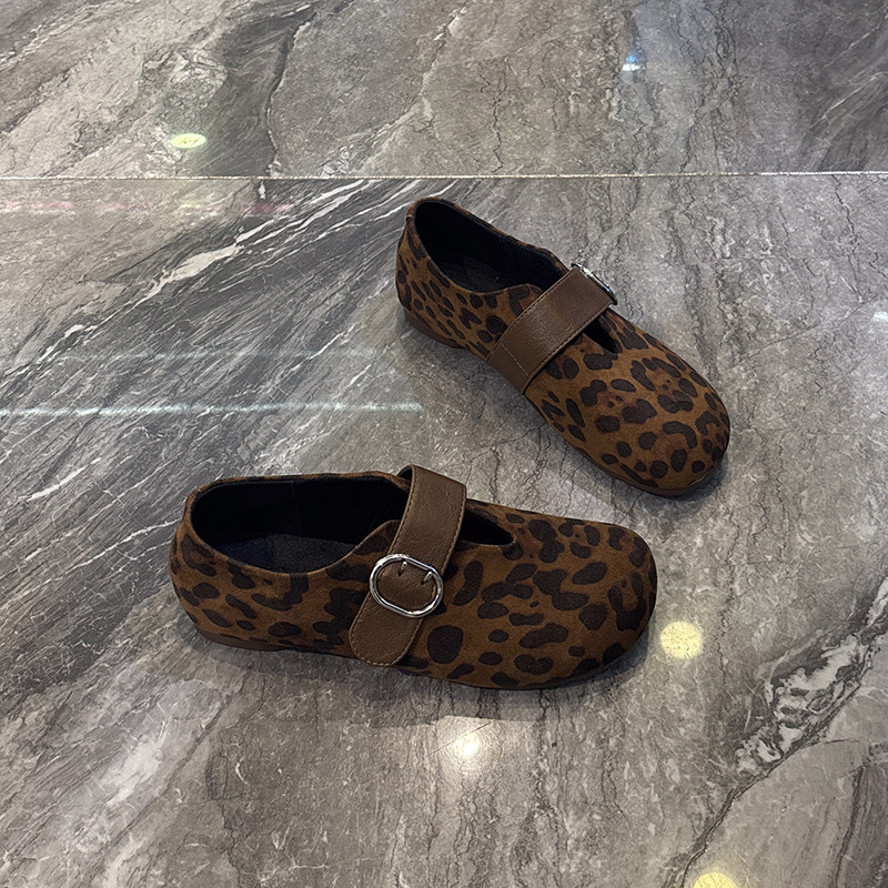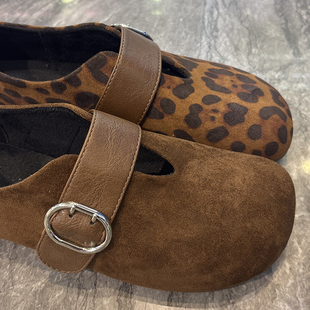 复古皮带扣勃肯单鞋 女2025冬新款 绒面平底浅口玛丽珍鞋 时髦豹纹