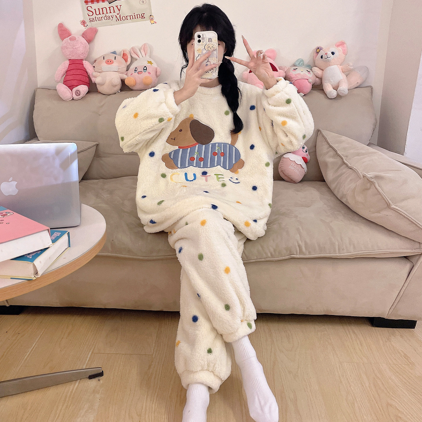 玉桂狗家居服套装 珊瑚绒睡衣女士秋冬季 套头加厚加绒卡通加肥大码
