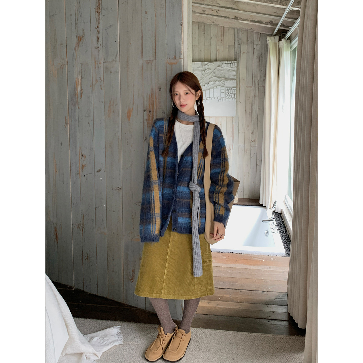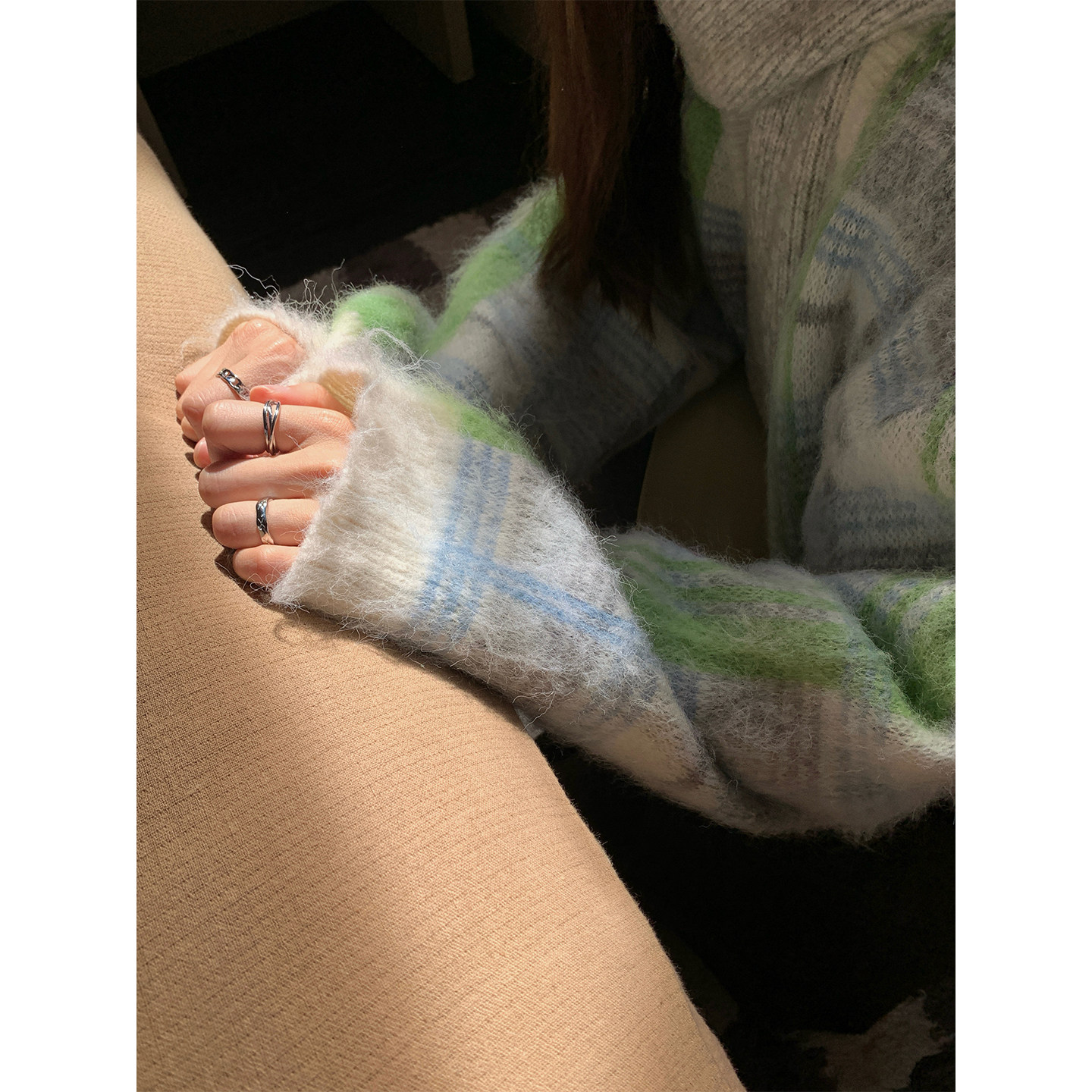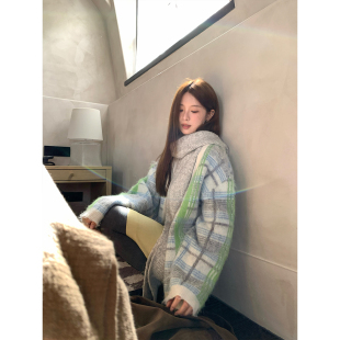 秋冬韩系少女通勤长毛拉毛拼色格纹V领毛衣开衫 CCKOK 女 现货