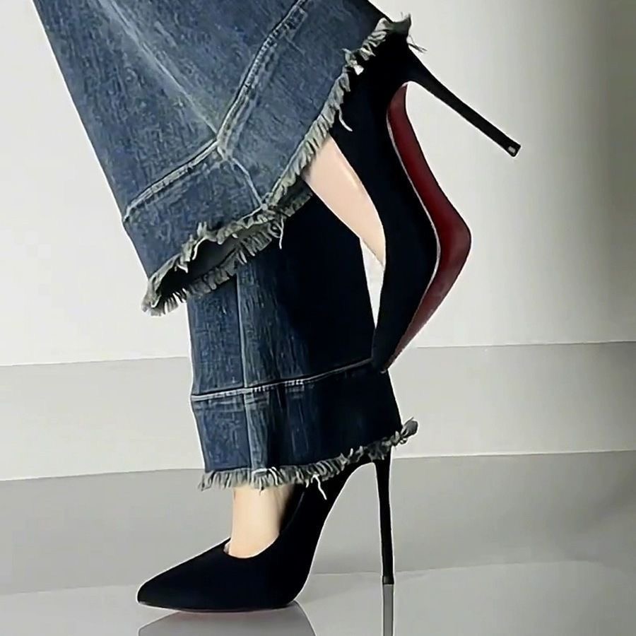 尖头不累脚通勤单鞋 职场工作鞋 2025年新款 黑色红底绒面细跟高跟鞋