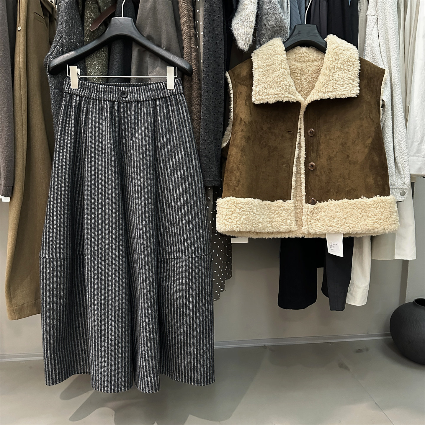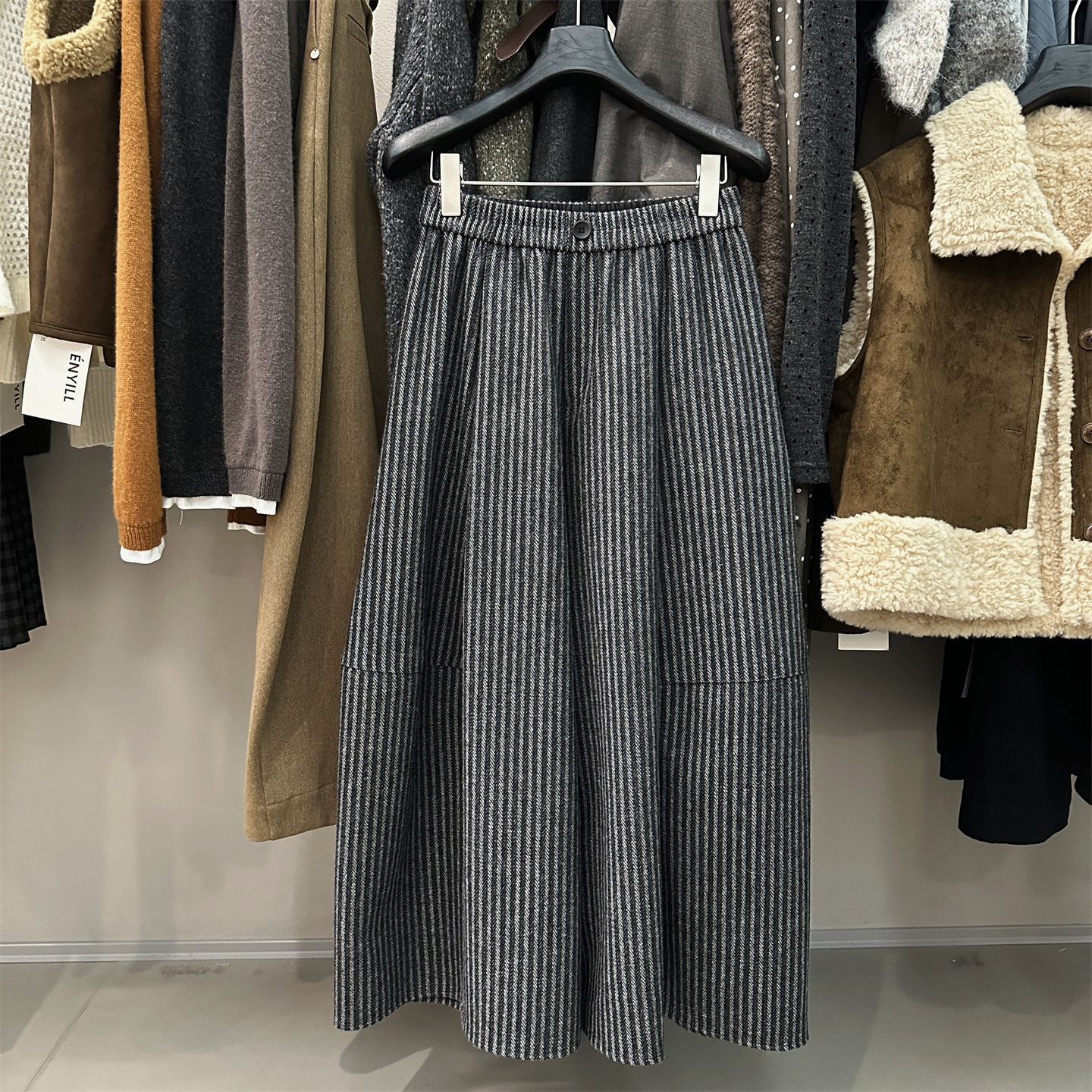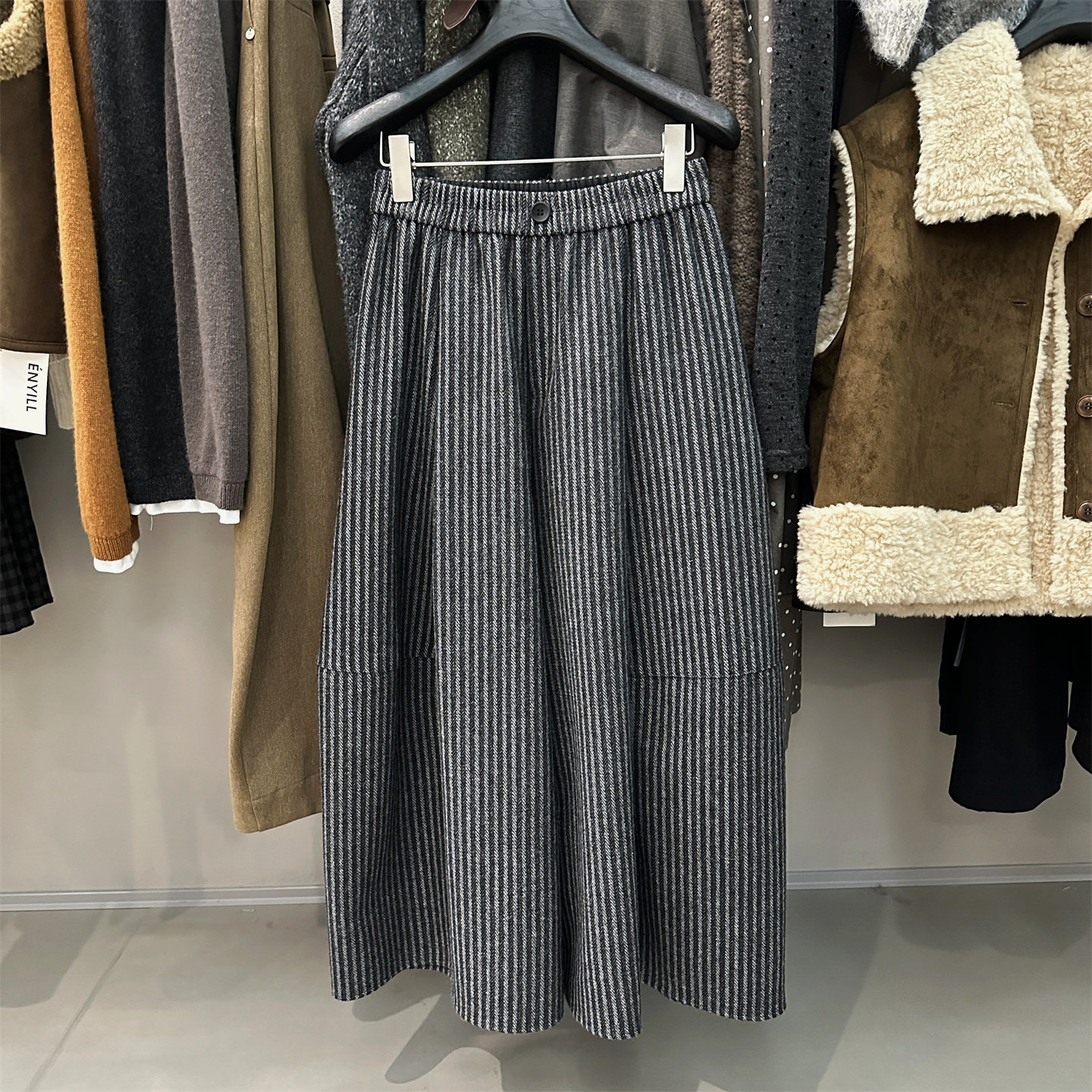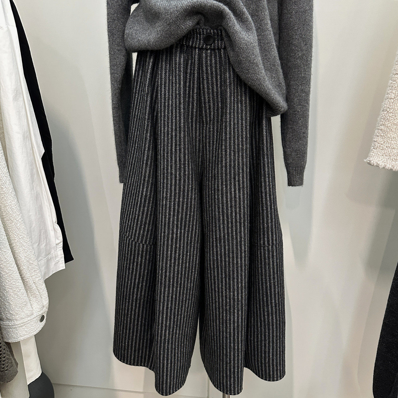设计感裙裤 深灰色竖条纹羊毛阔腿裤 九分裤 松紧腰一粒扣休闲裤 冬季