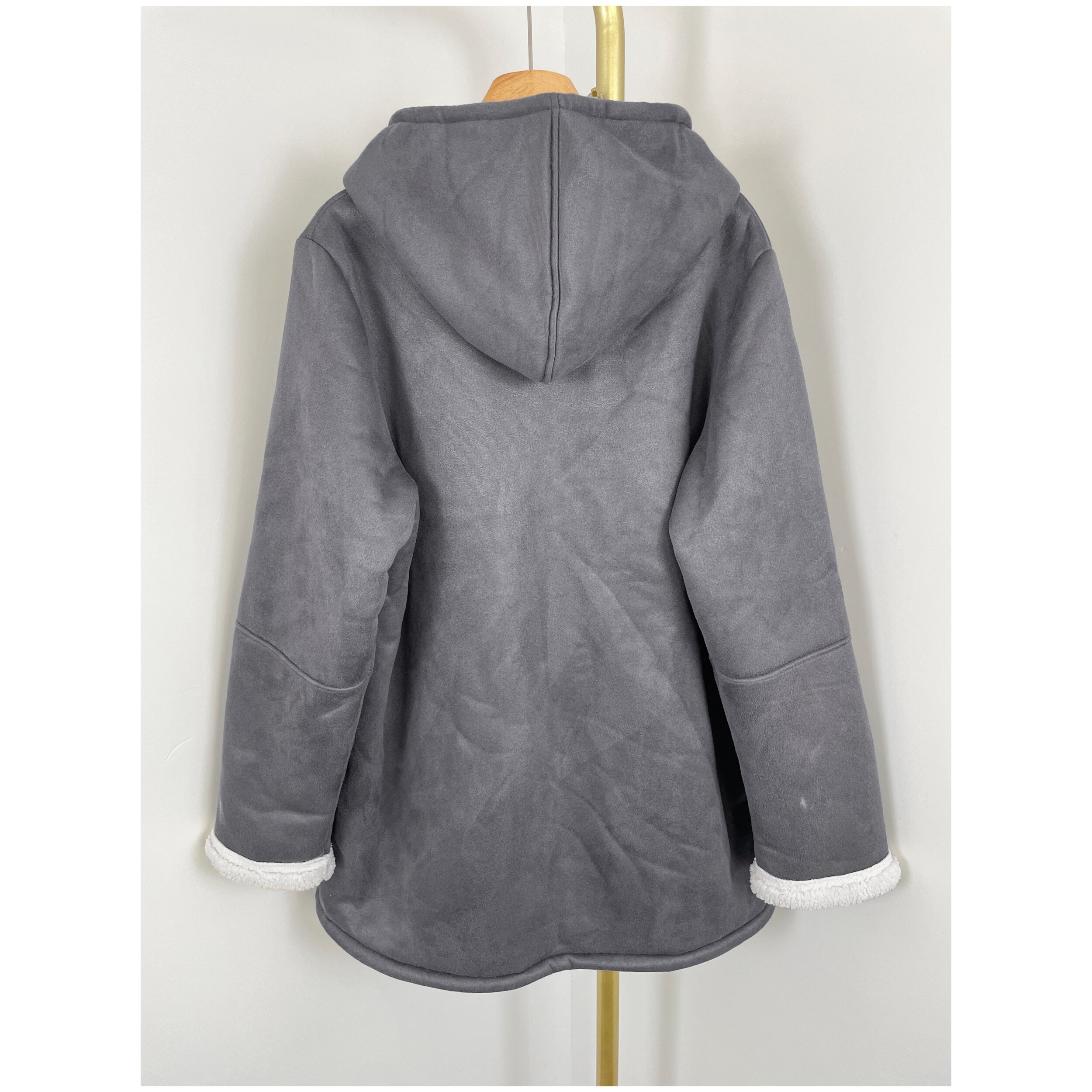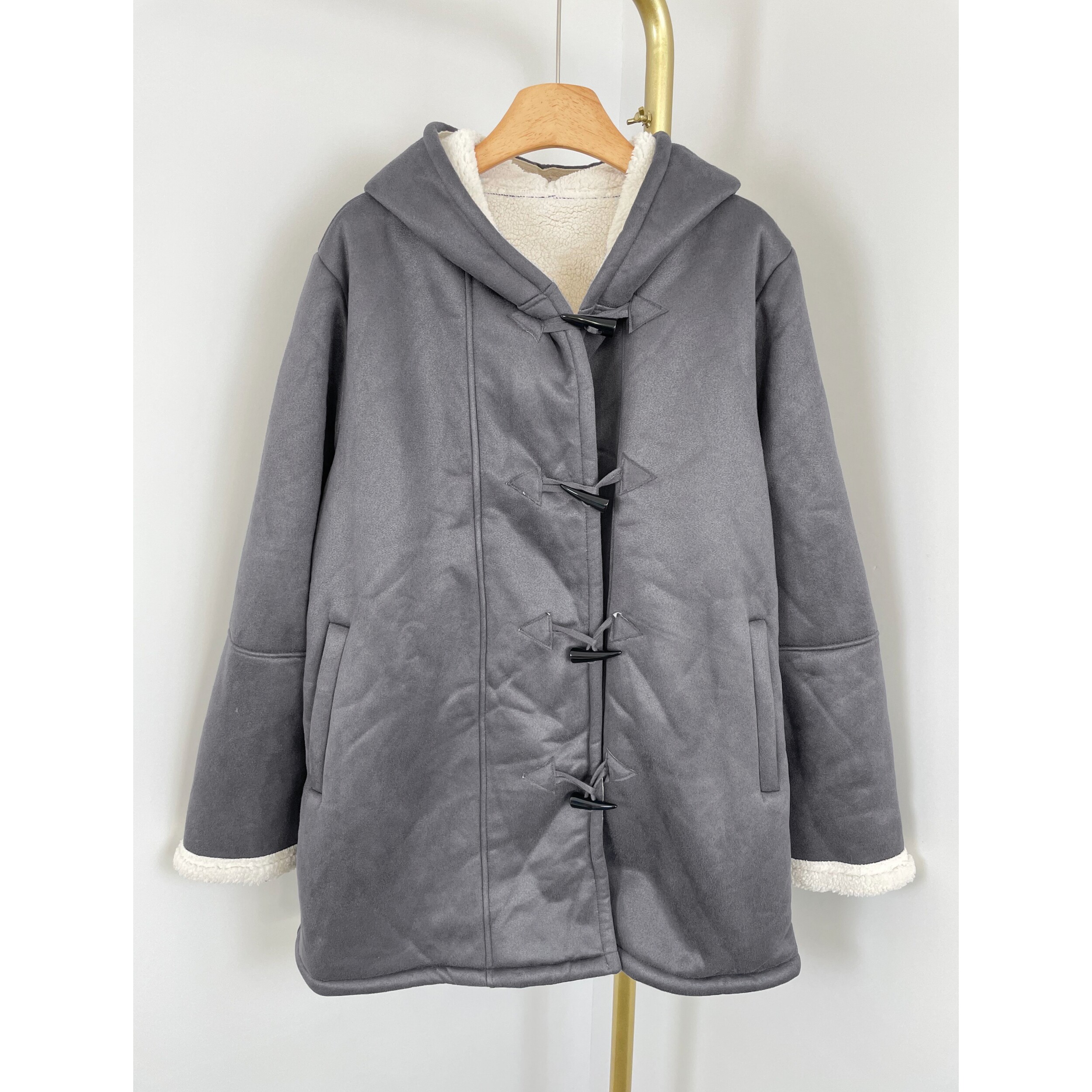 皮毛一体牛角扣羊羔毛大衣 女装 B1031麂皮绒时尚 连帽外套2025新款