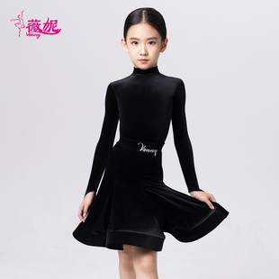薇妮舞服拉丁舞女童规定服长袖 高领丝绒大裙摆鱼骨国标考级比赛服