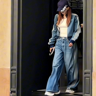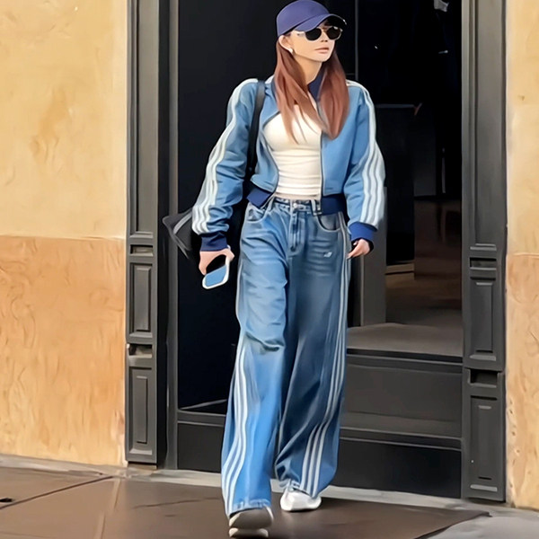 高腰阔腿裤 今年流行条杠拼接套装 立领宽松牛仔外套 新款 2025秋季
