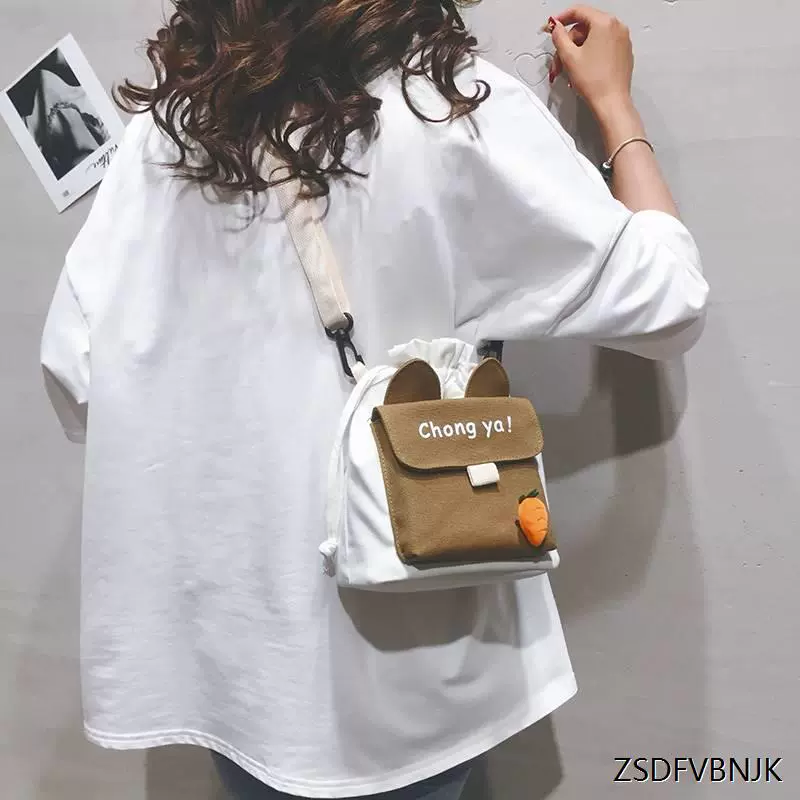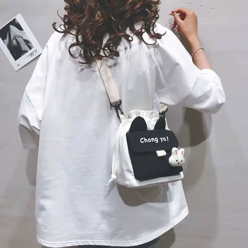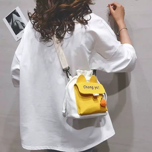 帆布小包包女2023新款 ins日系原宿可爱水桶包学生百搭单肩斜挎包