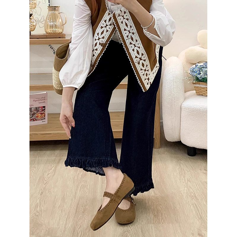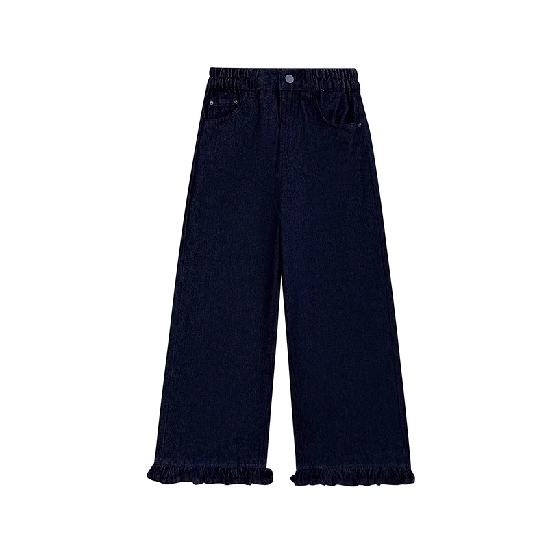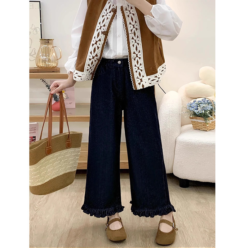 女xxs秋冬显瘦九分木耳边阔腿裤 145小个子时尚 丹宁色七八分牛仔裤