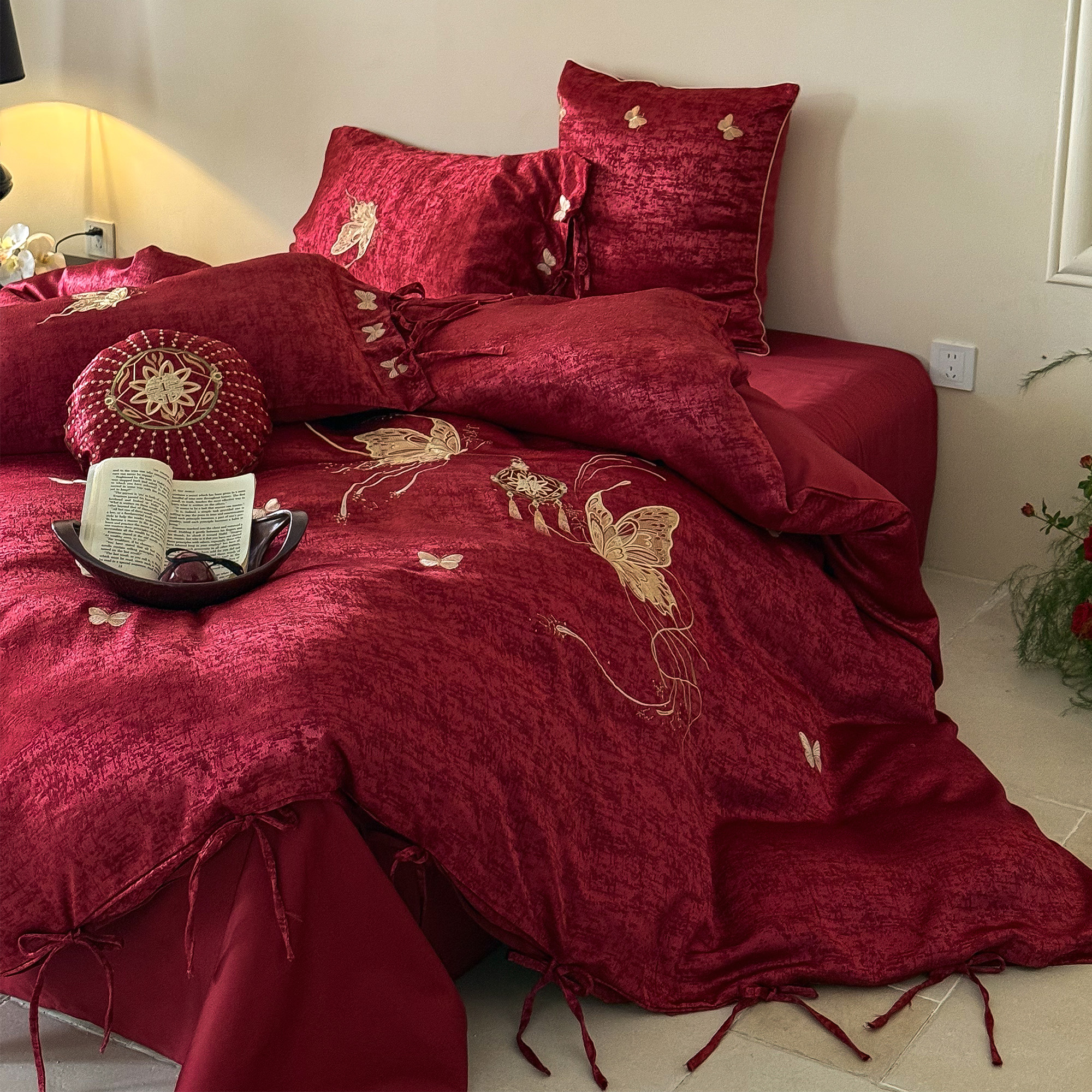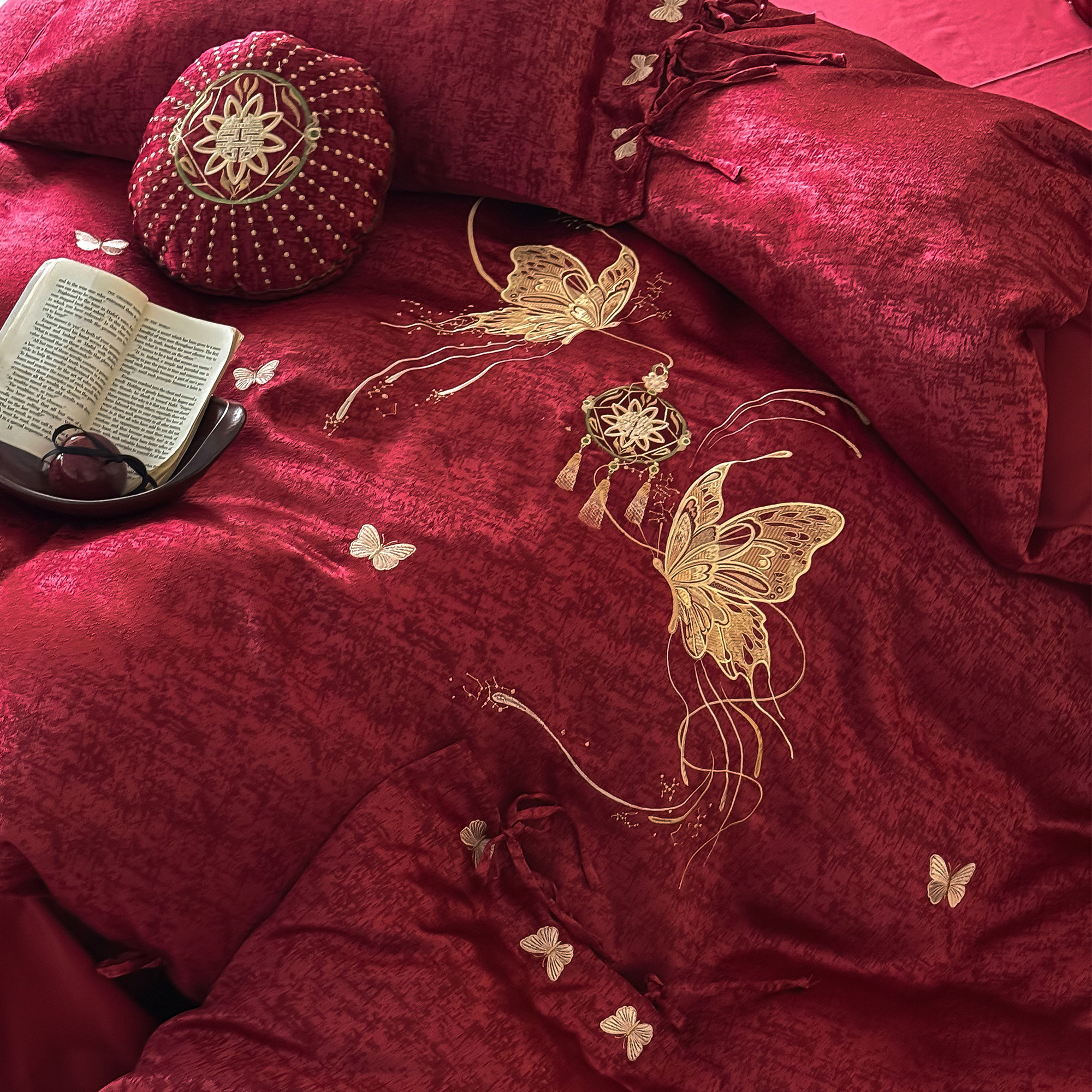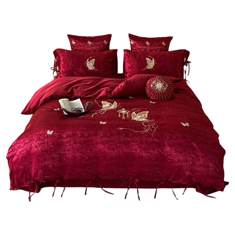 高档轻奢柔丝棉婚庆四件套长绒棉金蝴蝶刺绣红色结婚被套床单床笠