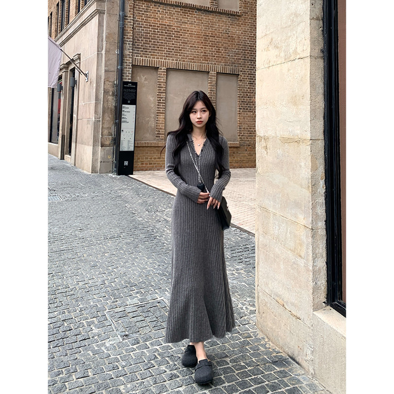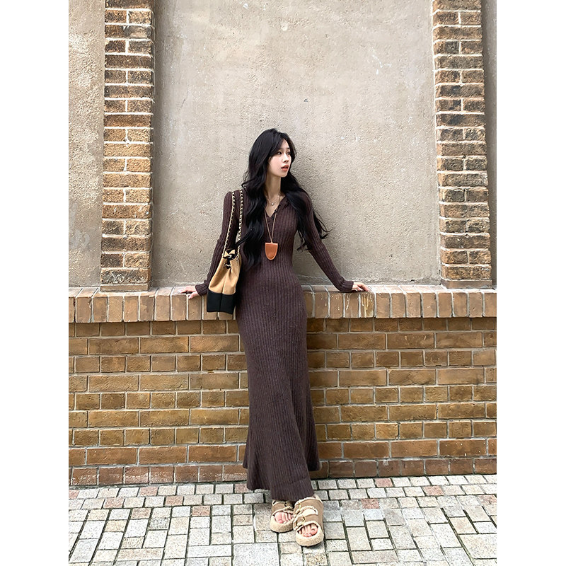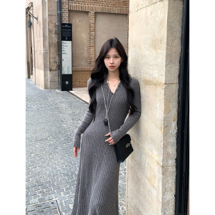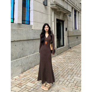 显瘦百搭气质V领长款 韩系修身 打底裙女 连帽针织连衣裙秋季 Adan