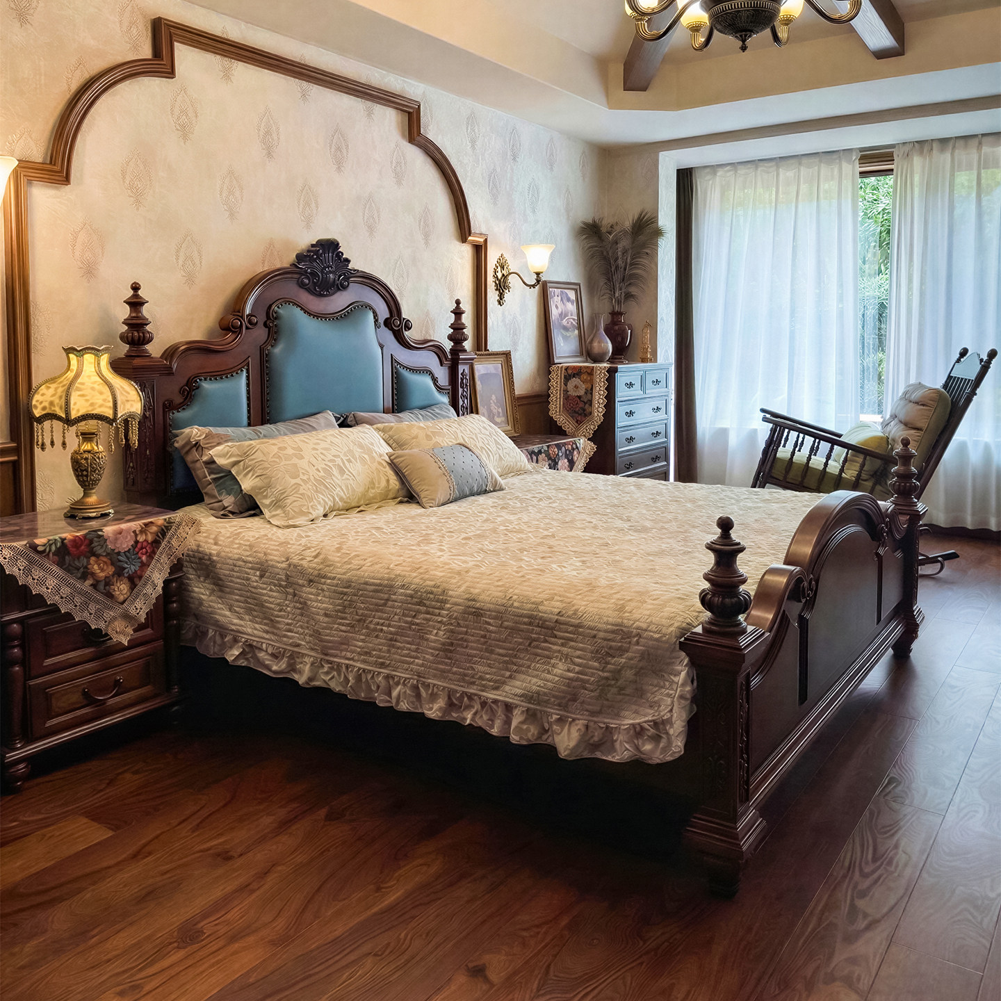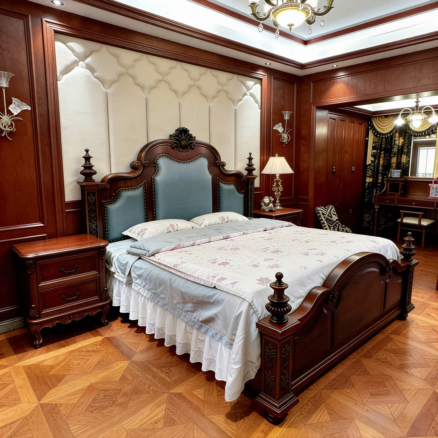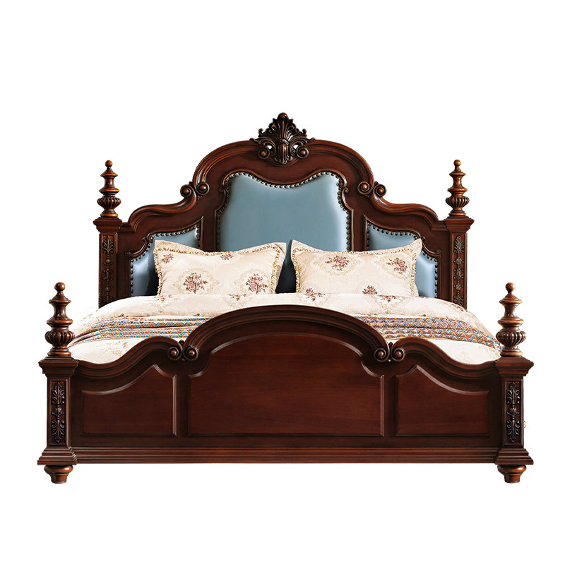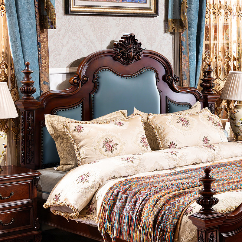 圣蒂伯爵美式 复古主卧室真皮软包双人床 别墅全实木雕花床法式