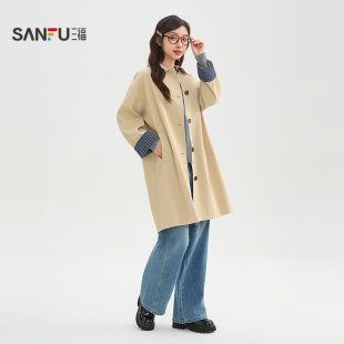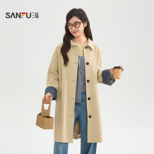 516782 风衣女装 三福单外套2026春季 格子内里翻领宽松中长款