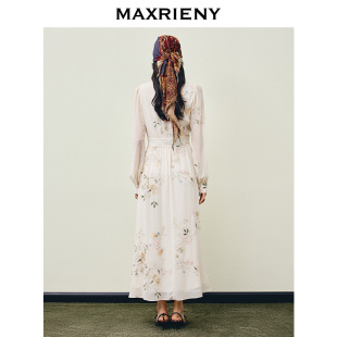 MAXRIENY米白色连衣裙2026年春季 蕾丝花卉刺绣收腰雪纺裙子 新款