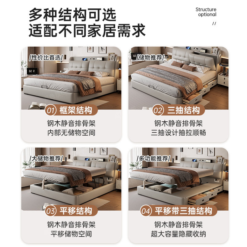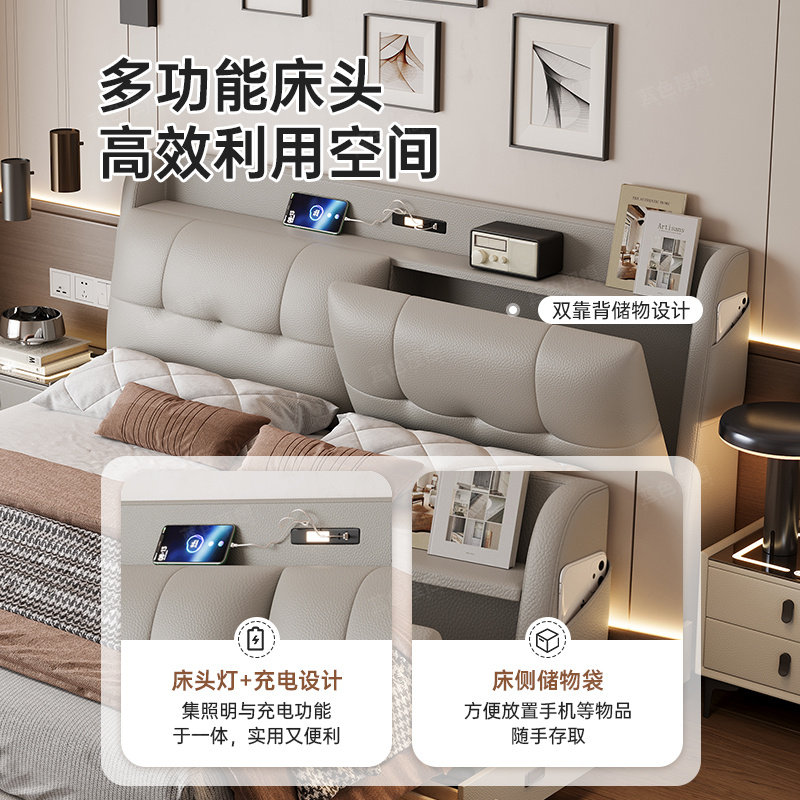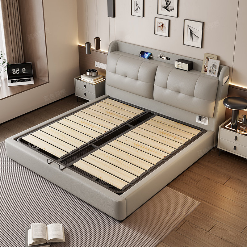 政府补贴蓝色理想平移气压真皮床带灯多功能床头储物高箱皮床