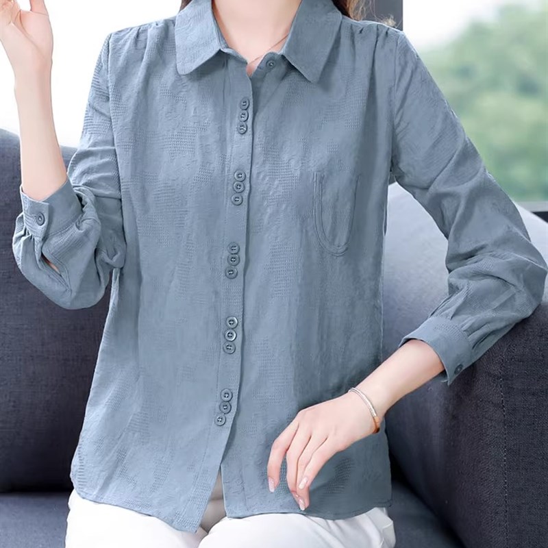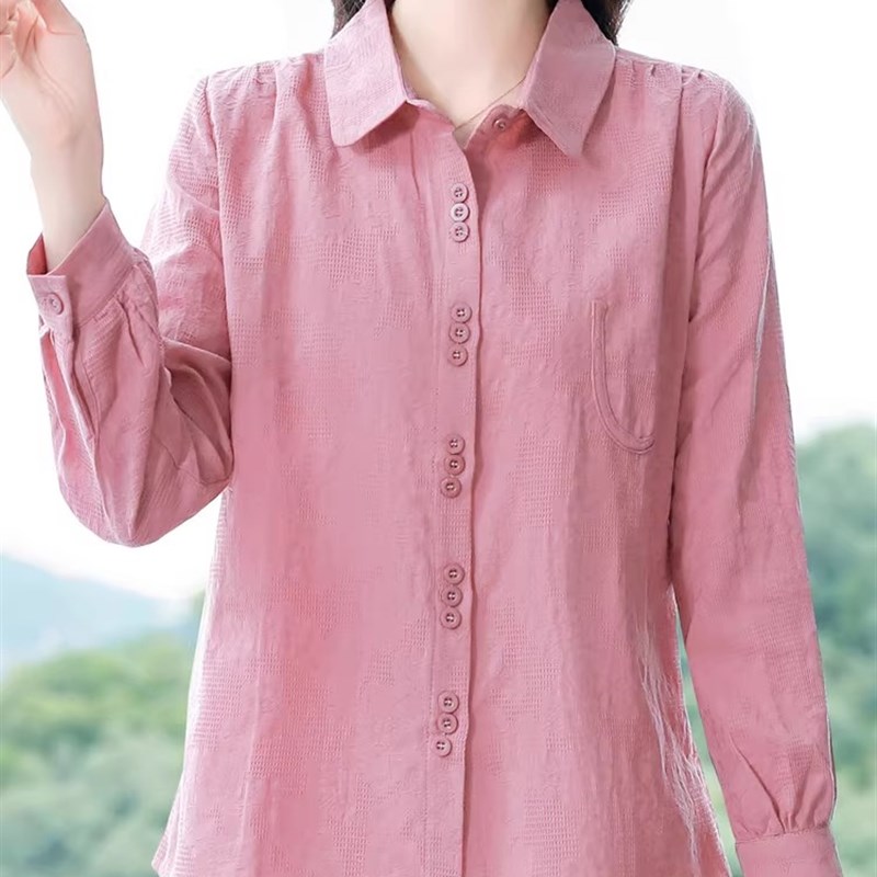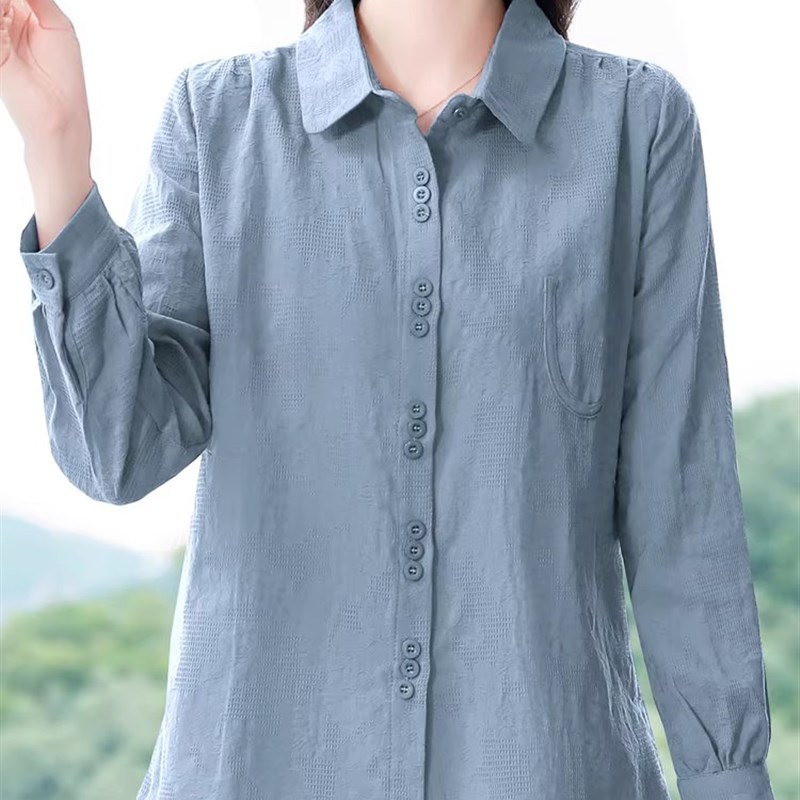 大码 高端提花长袖 时尚 女士中年妈妈春装 亚麻上衣洋气衬衣 棉麻衬衫