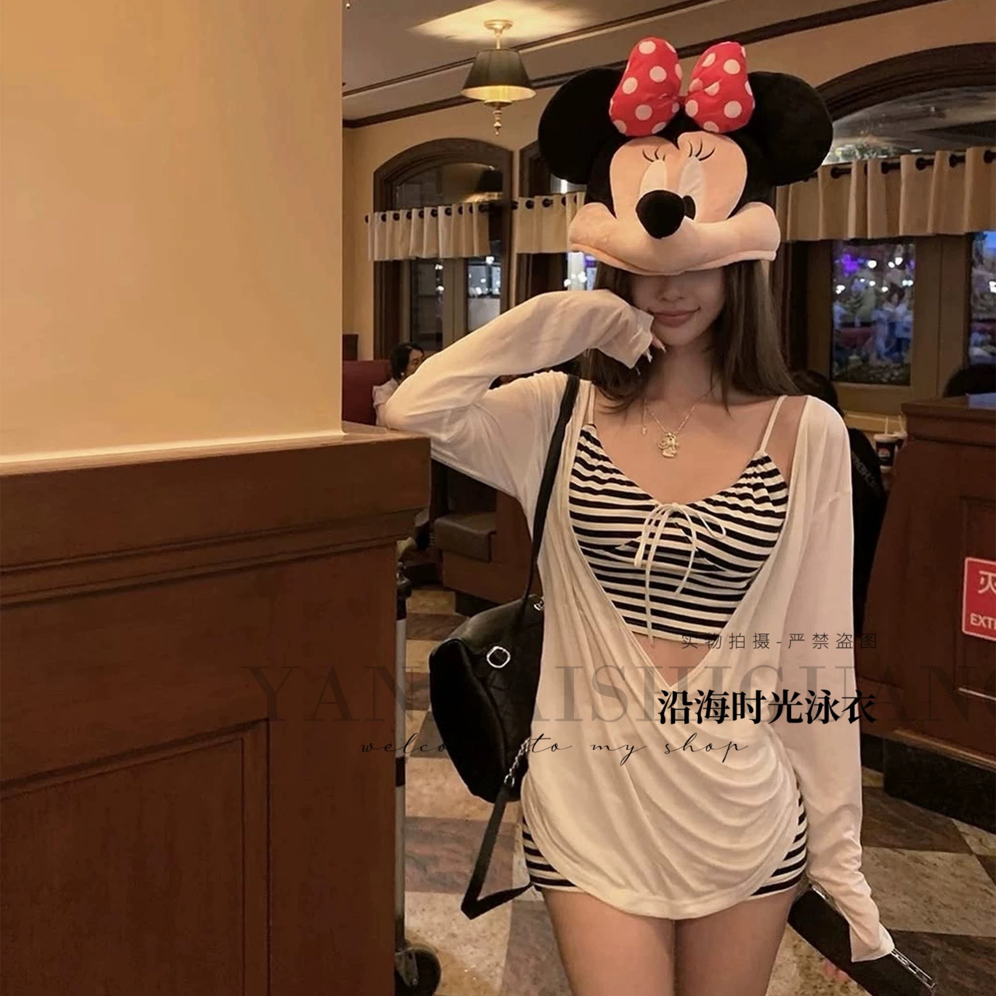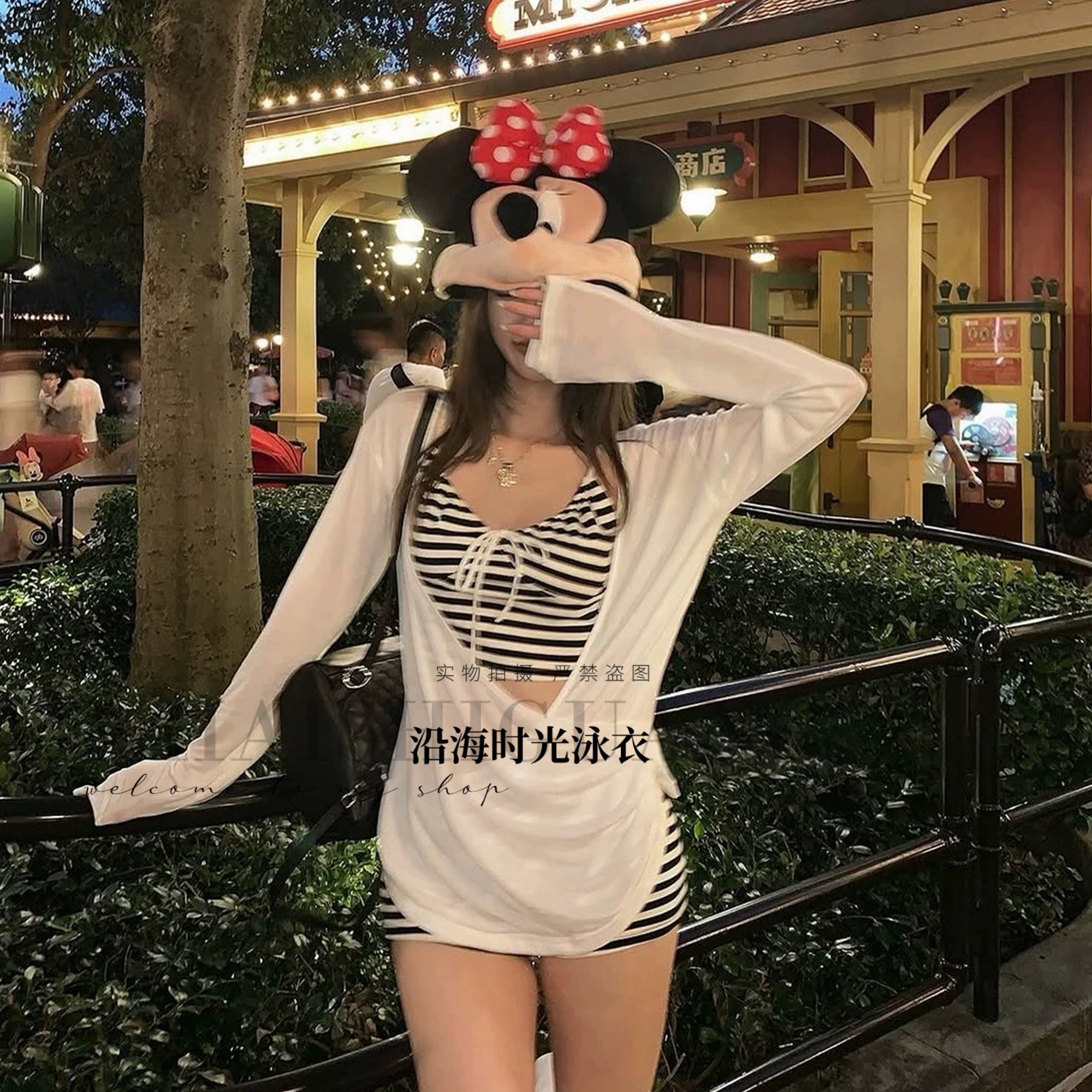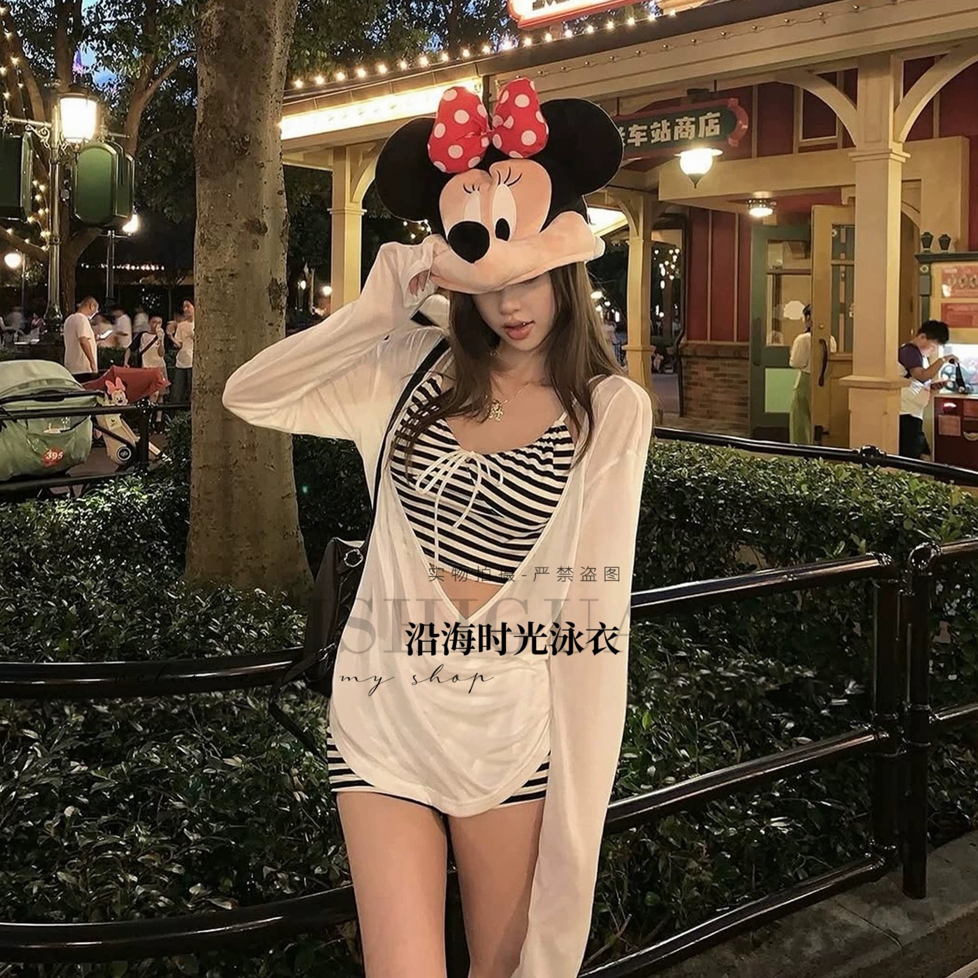 泳衣女纯欲甜美条纹保守罩衫 分体平角比基尼三件套聚拢度假风泳装