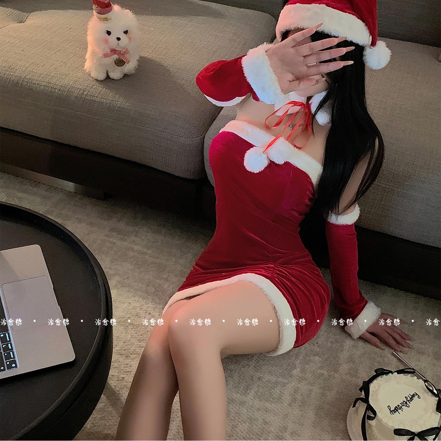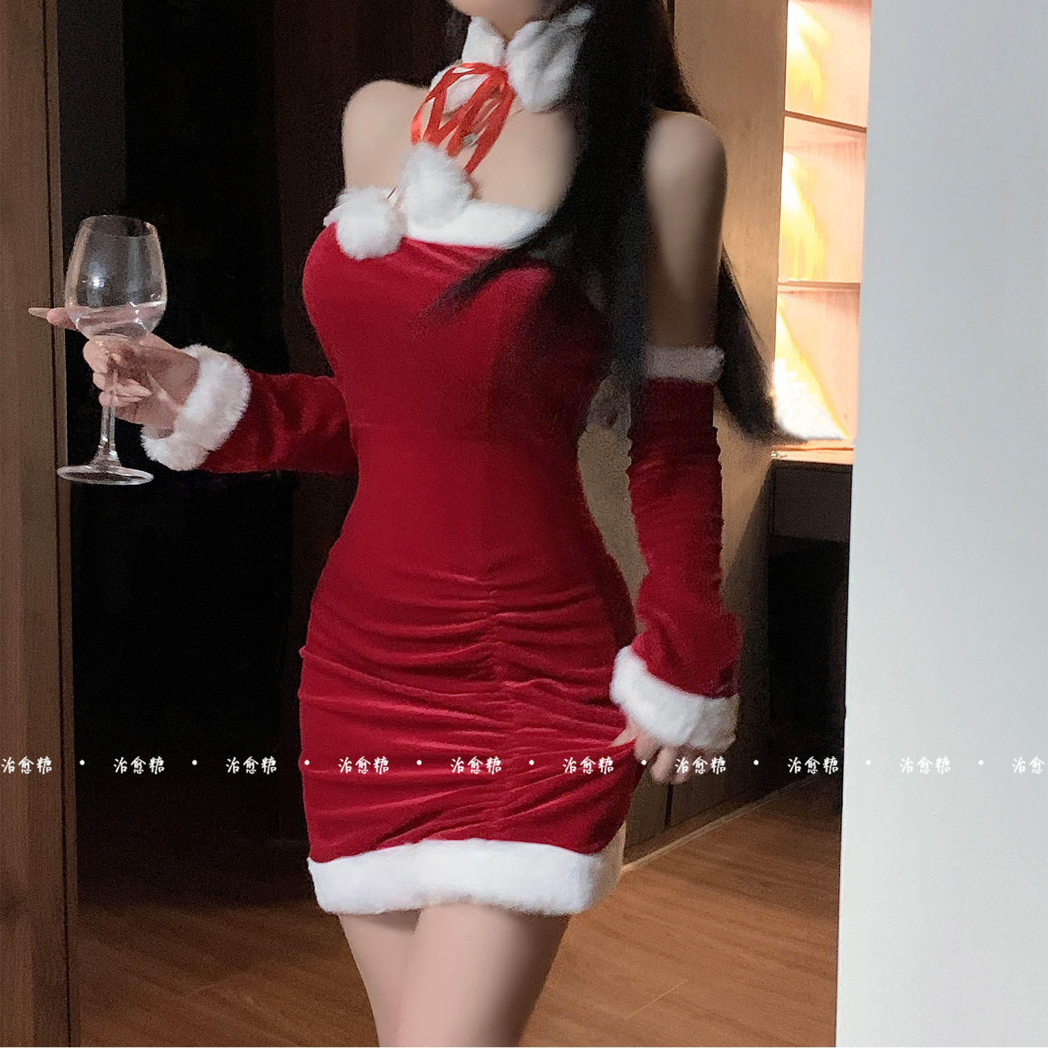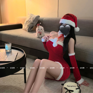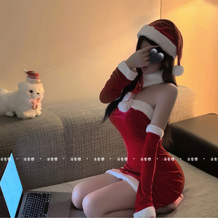 圣诞制服性感辣妹紧身连衣裙红色毛绒氛围感纯欲风抹胸包臀裙情调