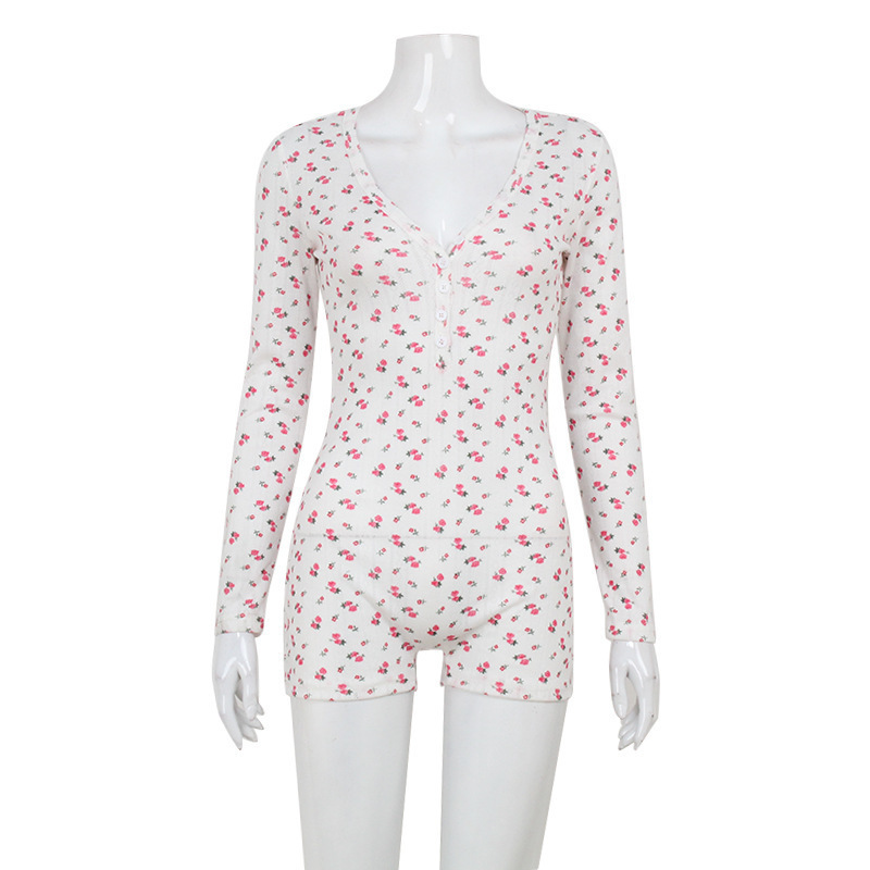 时尚 短裤 碎花印花长袖 居家连体裤 连体衣V领纯欲修身 jumpsuit新款