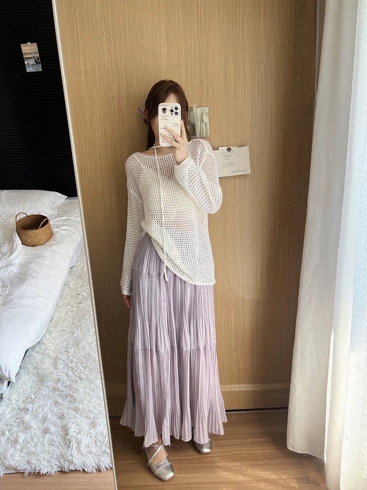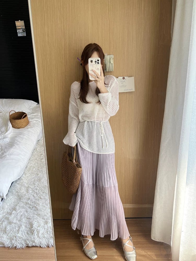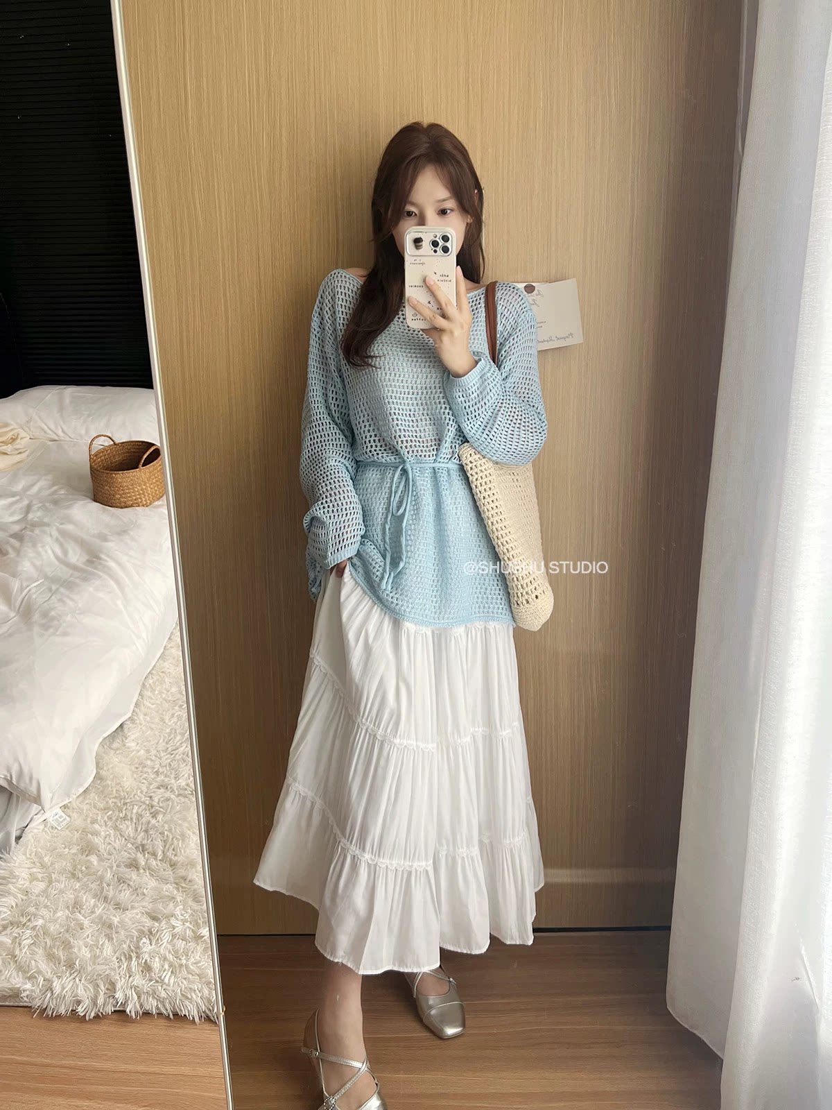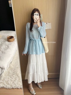 绑带收腰空调罩衫 法式 女春夏薄款 冰丝针织衫 上衣 镂空蓝色慵懒长袖