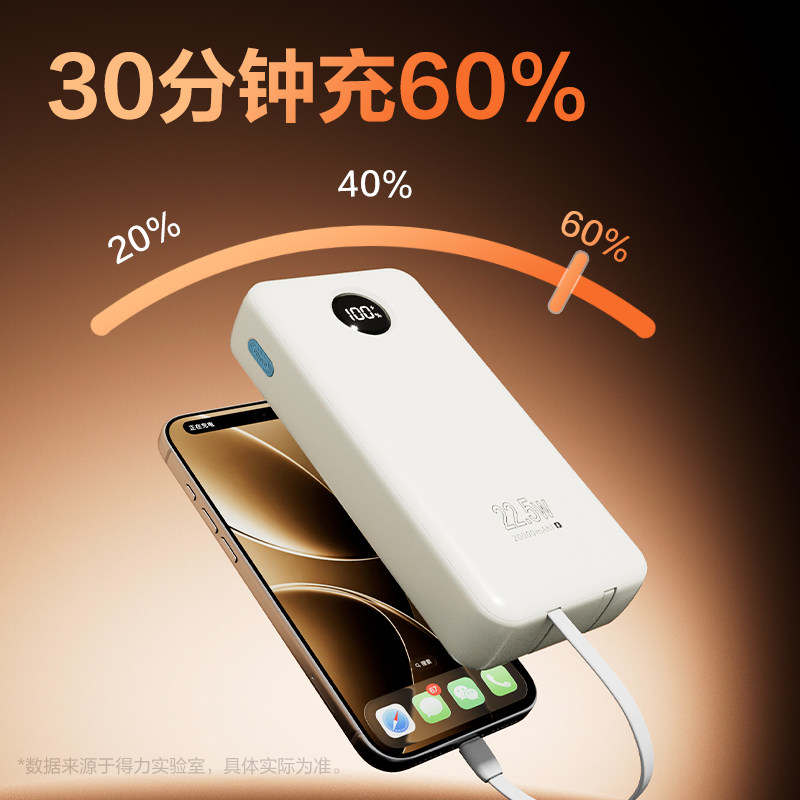 得力3C认证自带线充电宝20000毫安快充超薄迷你10000毫安超大容量便携移动电源适用华为小米苹果专用可上飞机