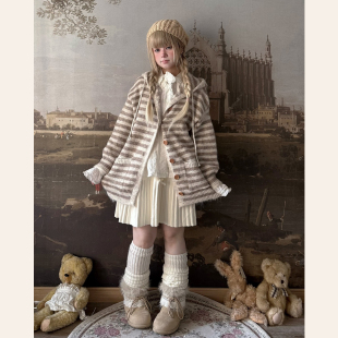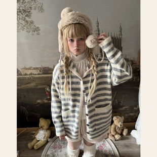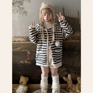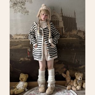 女秋冬宽松落肩外套 甜美可爱条纹连帽单排扣毛衣开衫 Labeau 冬日