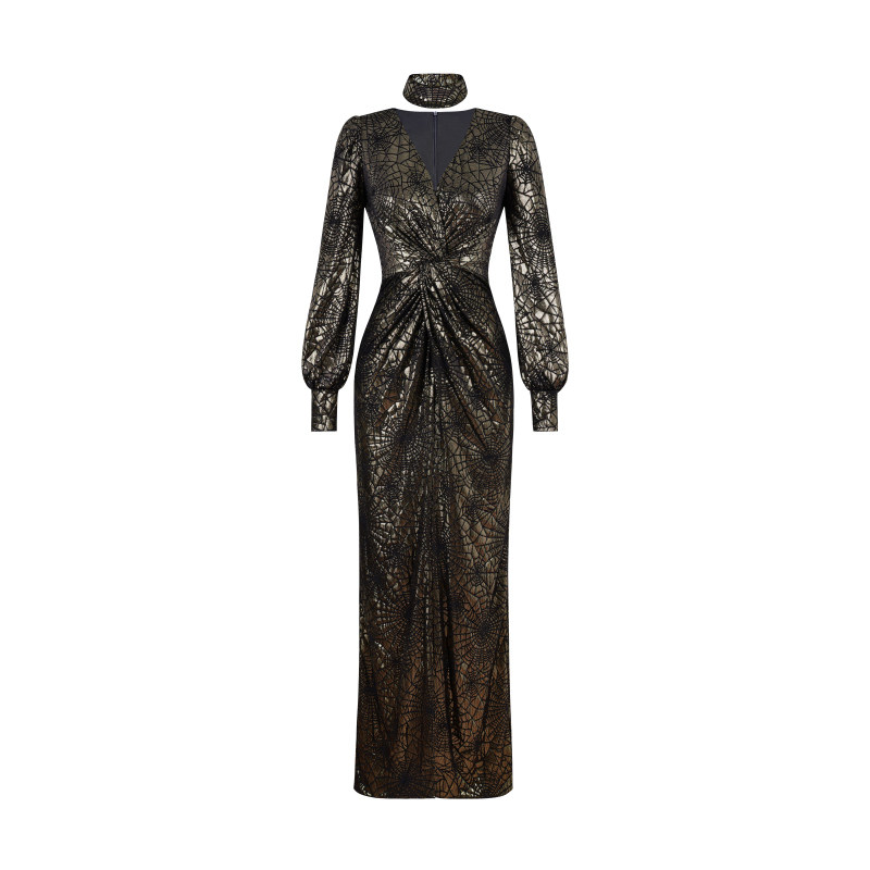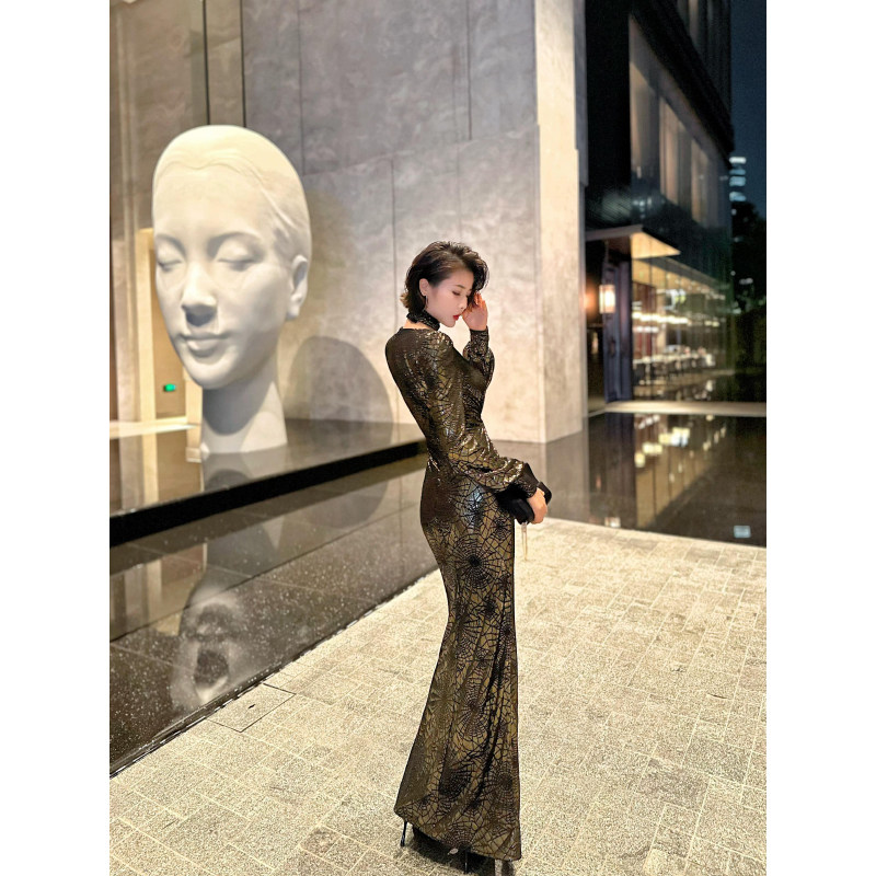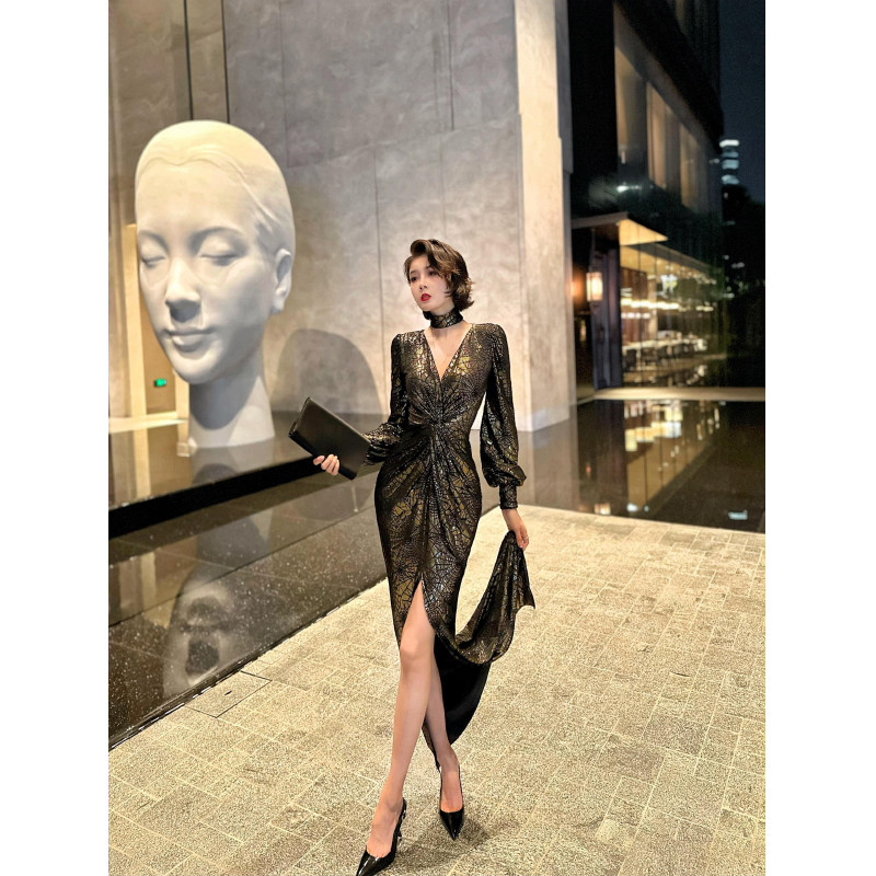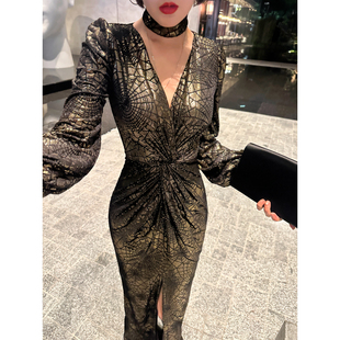 XULU原创秋冬丝绒烫金网格礼服长裙气质名媛修身 前开叉V领连衣裙