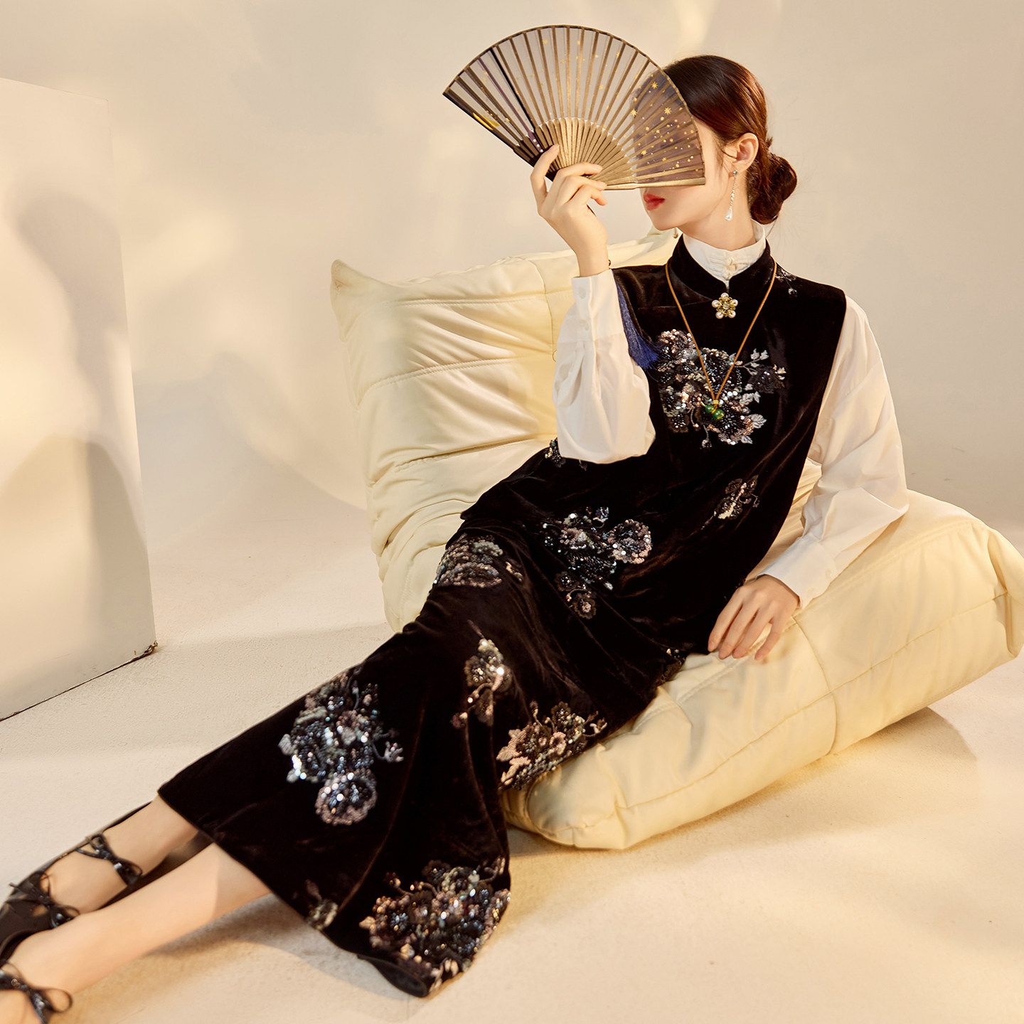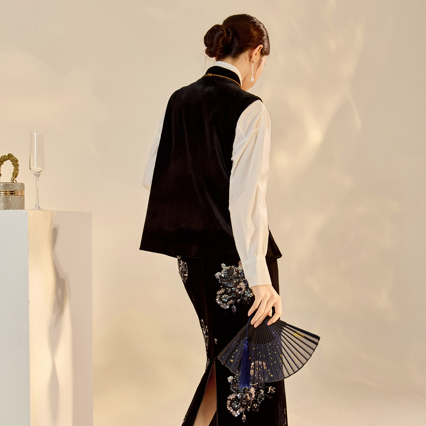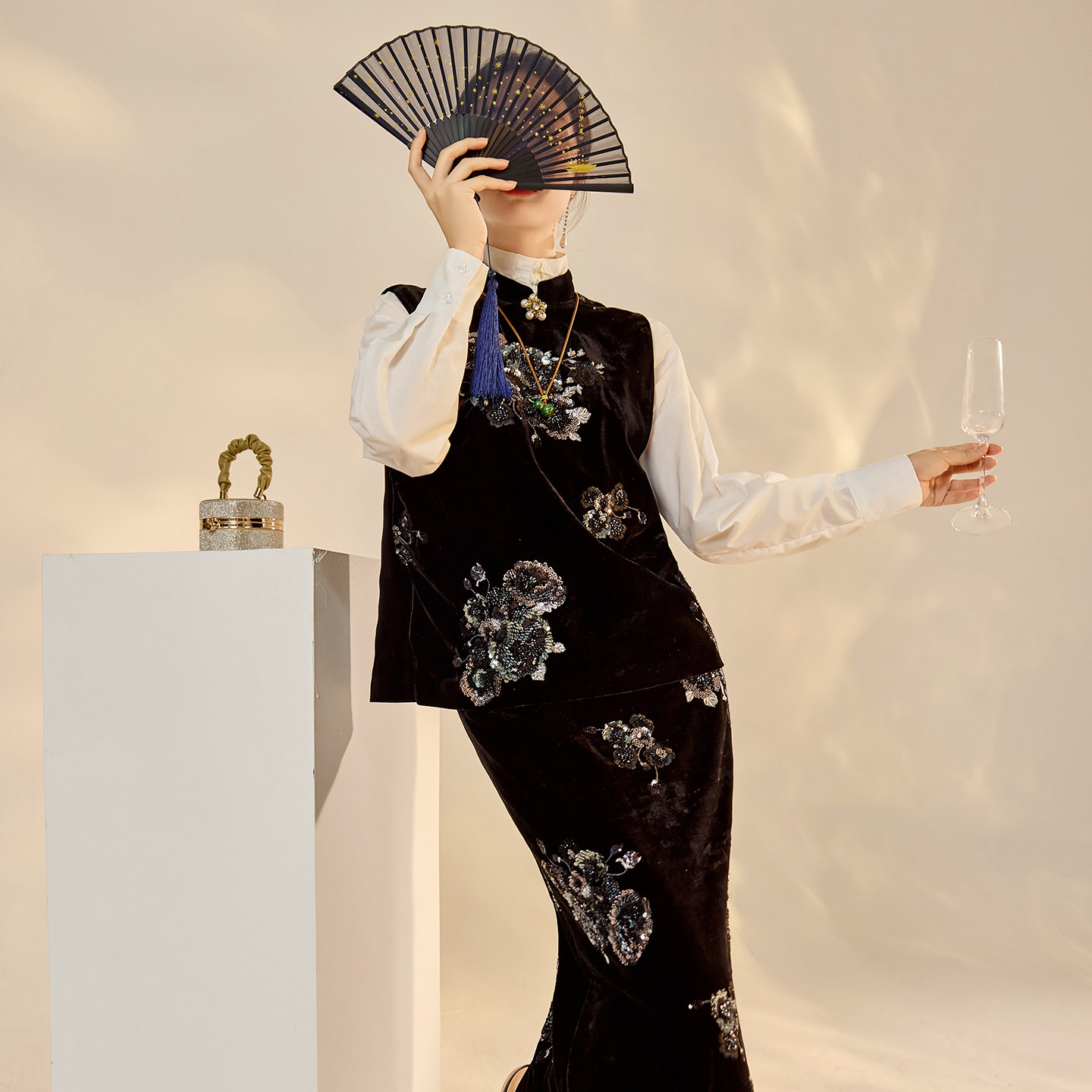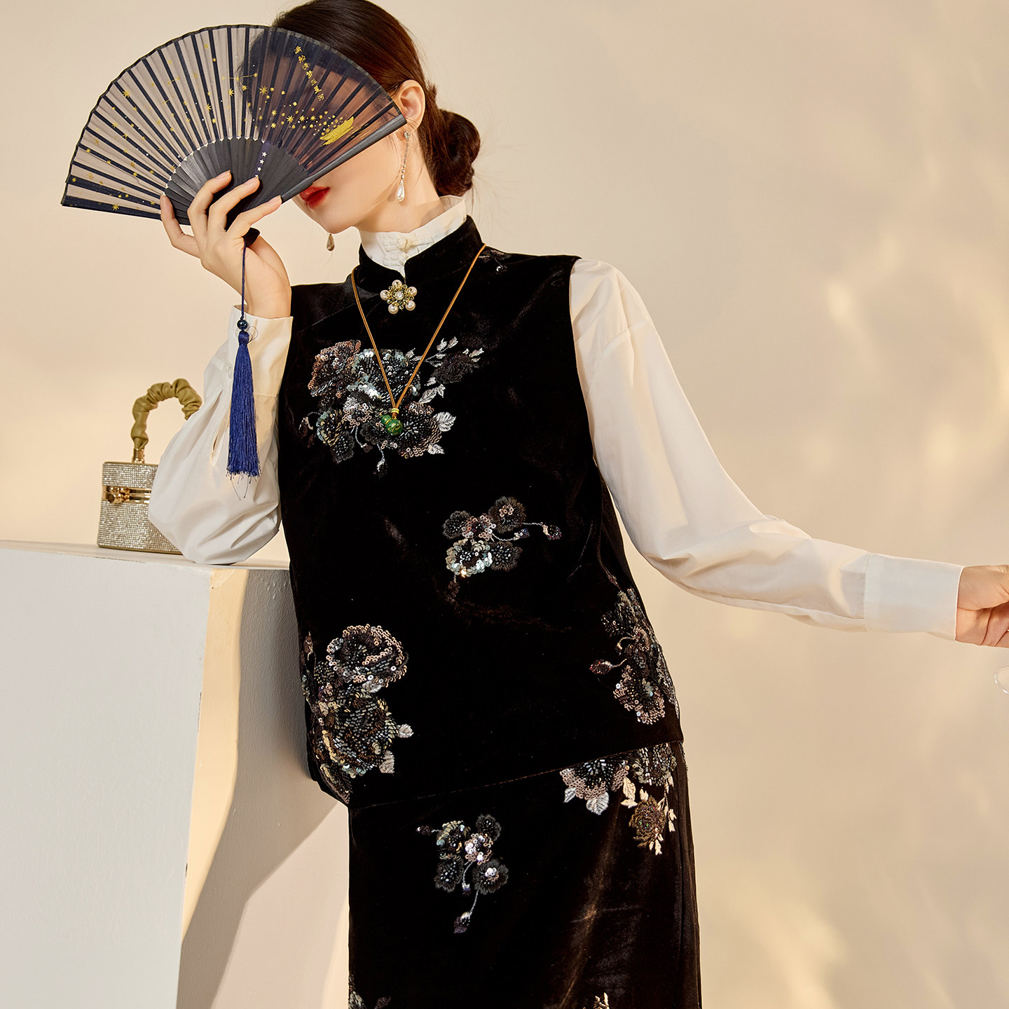 N9093 设计高端半裙气质套装 新中式 国风亮片玫瑰刺绣马甲重工时尚