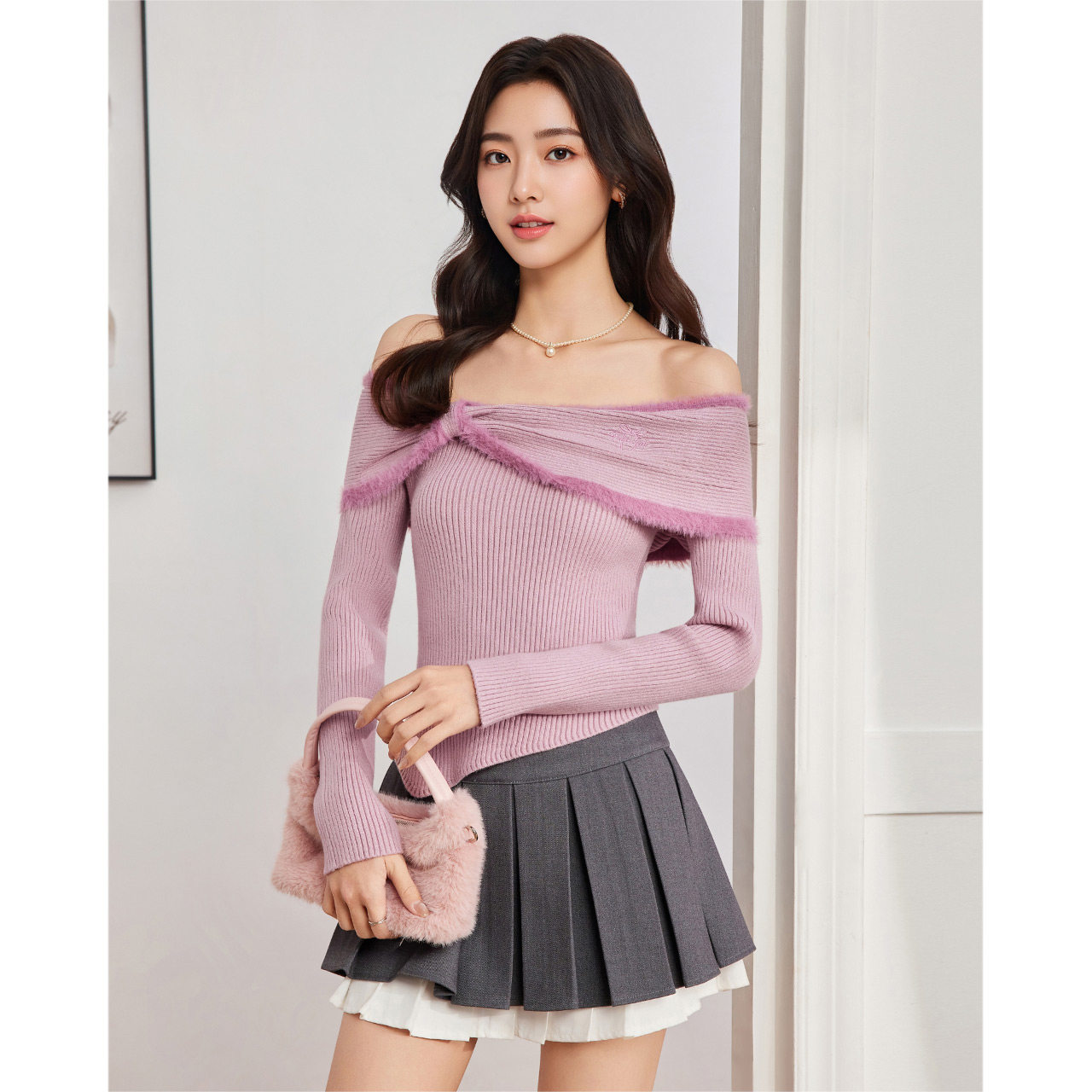 一字肩气质千金温柔风刺绣蝴蝶结毛织上衣 新款 IEF 爱依服2025秋季