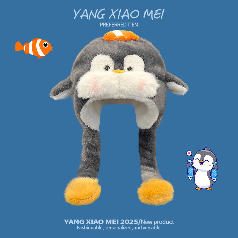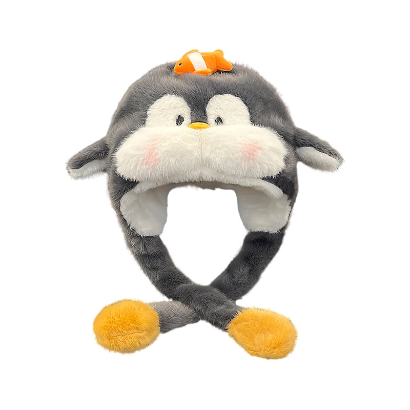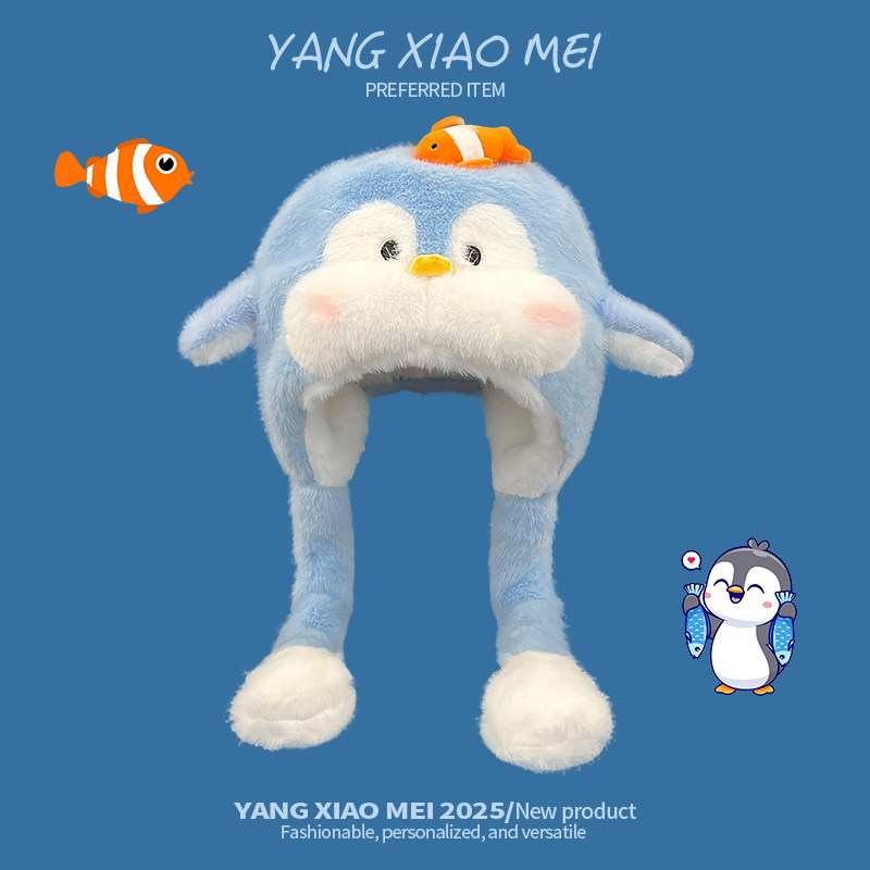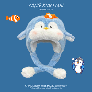 可爱腮红企鹅捏一捏耳朵会动毛绒帽子女冬季 加厚保暖护耳雷锋帽女