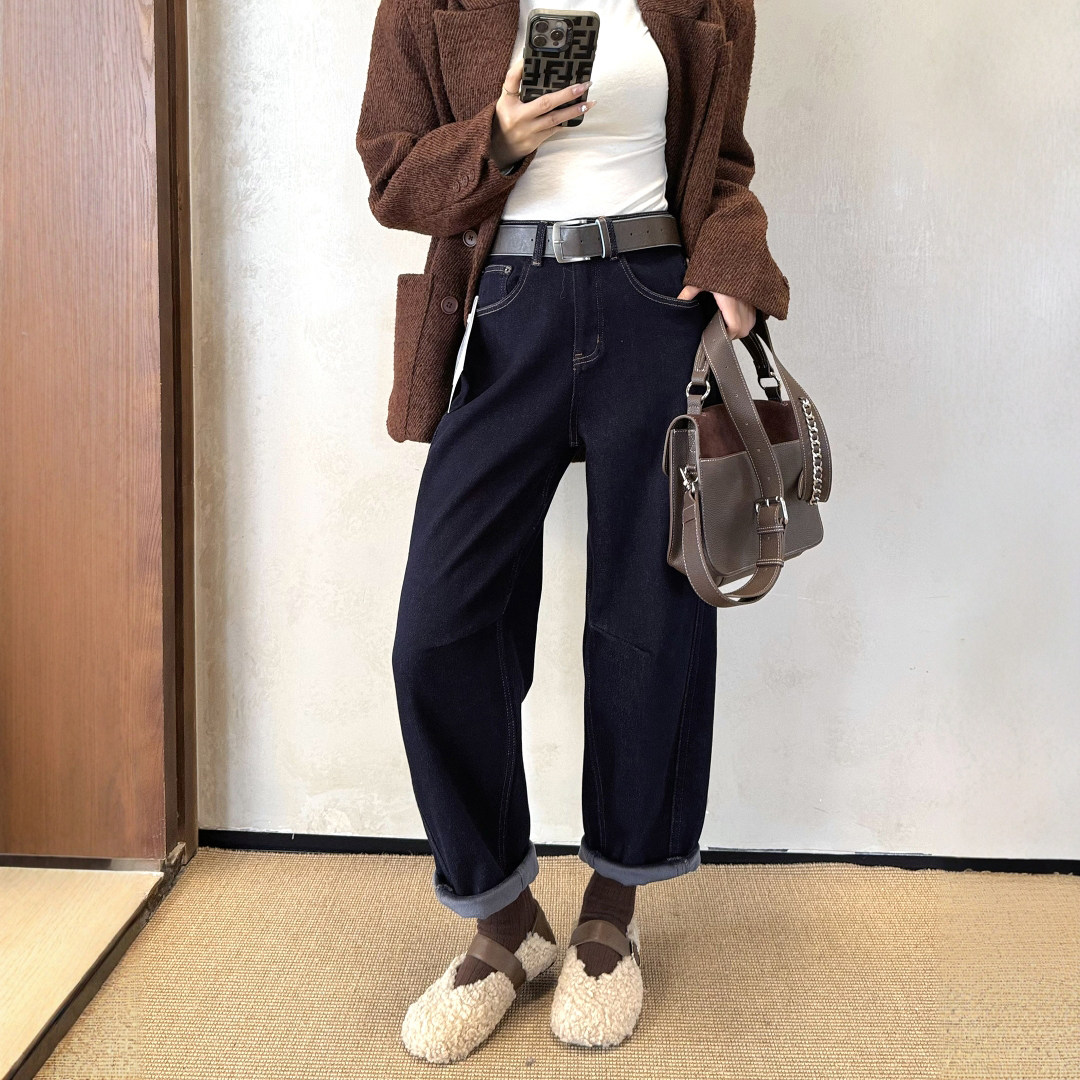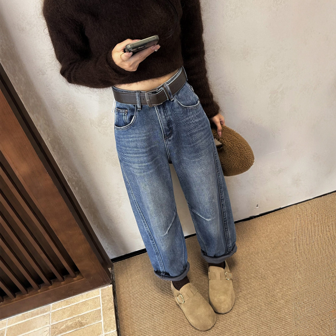 老爹裤 冬季 女宽松高腰显瘦九分休闲哈伦裤 蓝色加绒加厚牛仔裤 新款