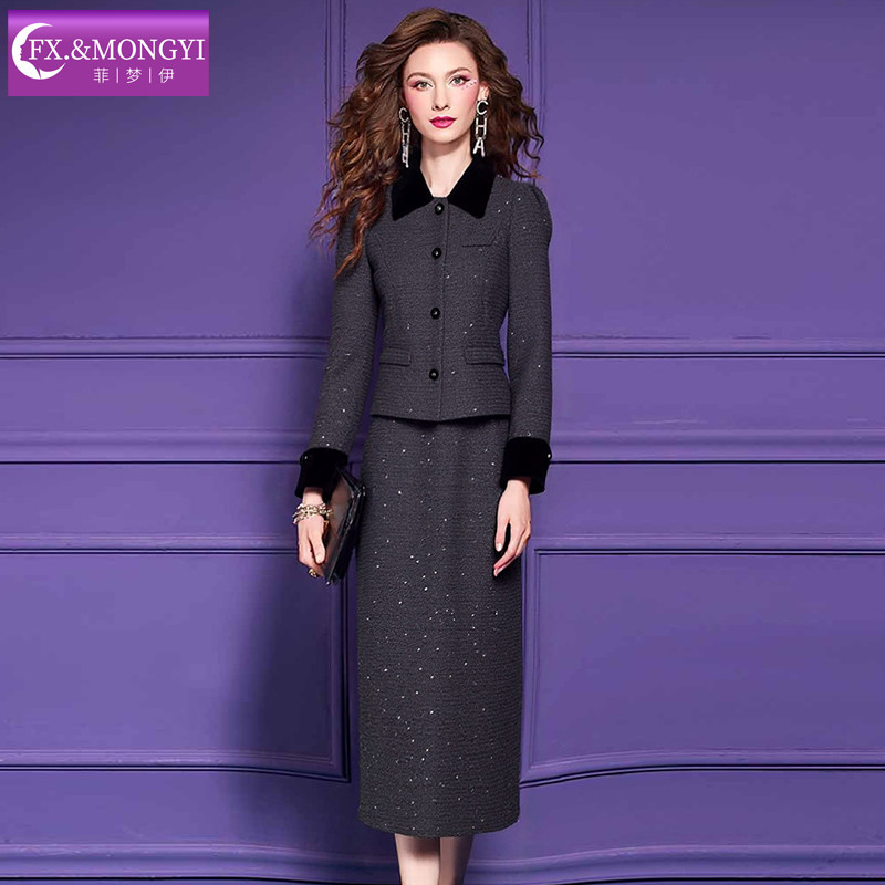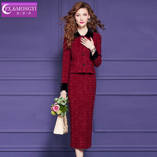 菲梦伊含羊毛小香风套装 高端名媛翻领毛呢外套包臀半身裙子 女冬季