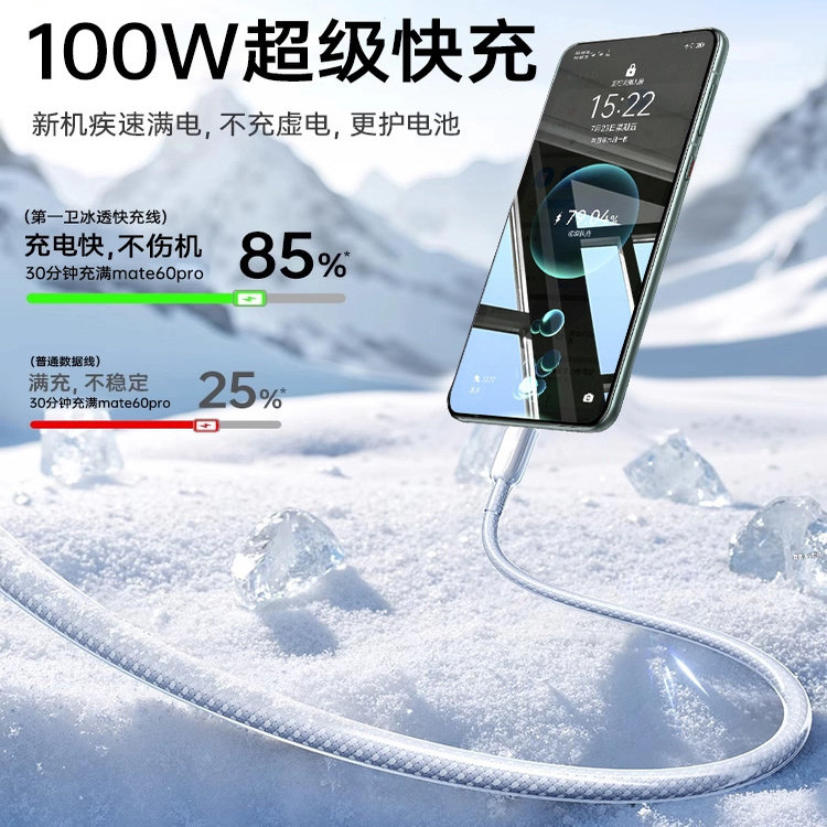 120W快充数据线适用苹果华为一拖三手机充电线2米蓝色单条装