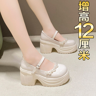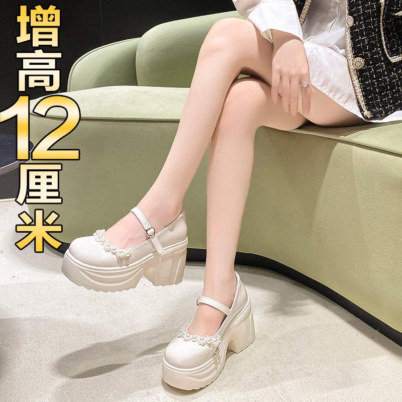 女小个子厚底粗跟防水台超高跟白色单鞋 增高婚鞋 12cm玛丽珍高跟鞋