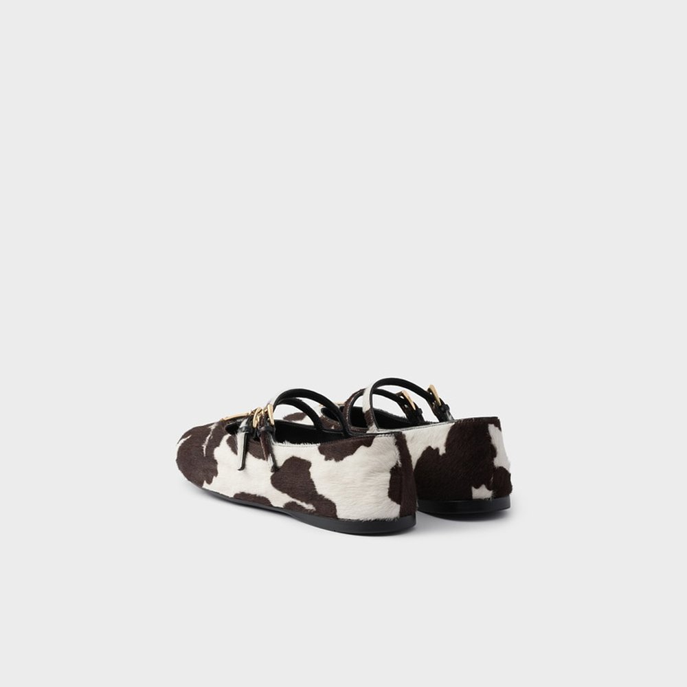 自营欧洲直邮Prada普拉达 深棕色小牛皮动物纹印花平底 女士白色