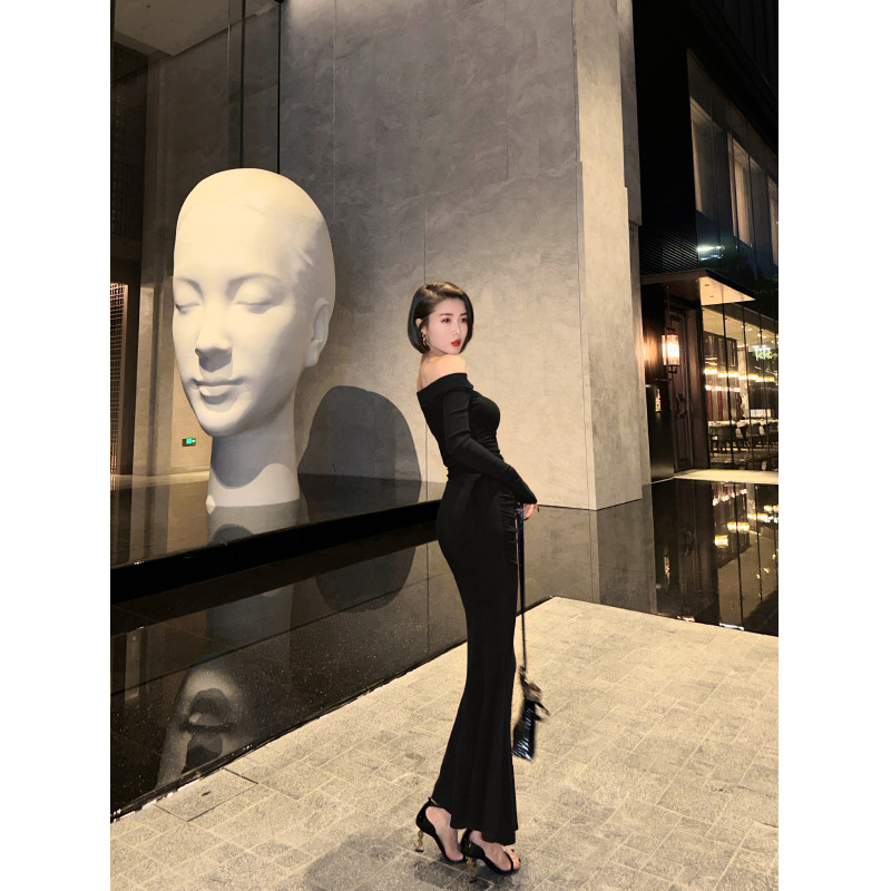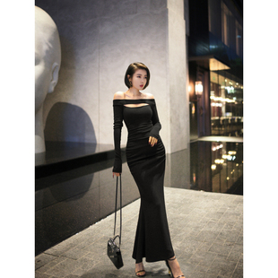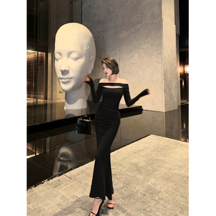 XULU原创美利诺慕斯绒针织优雅黑色一字肩镂空收腰长款 鱼尾连衣裙