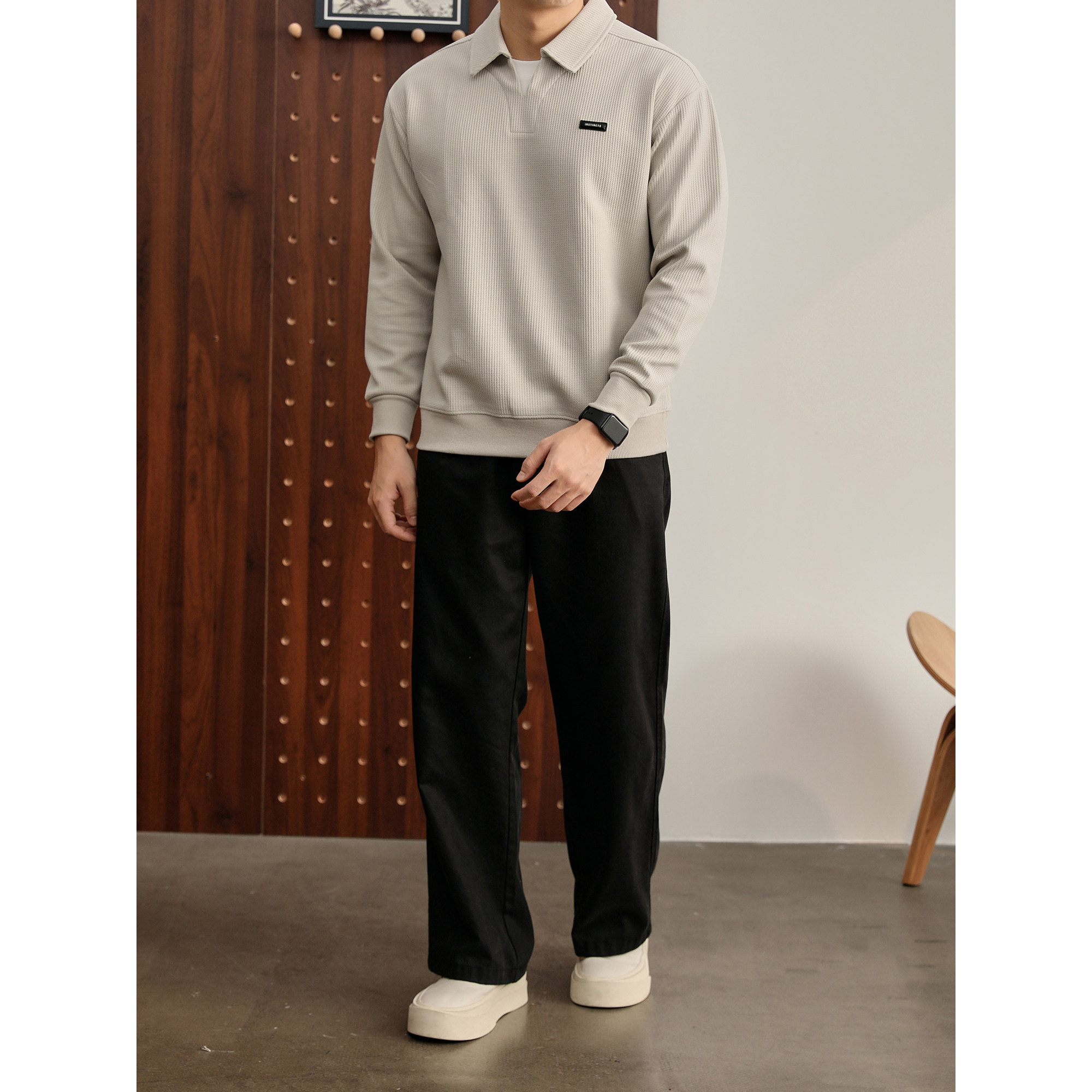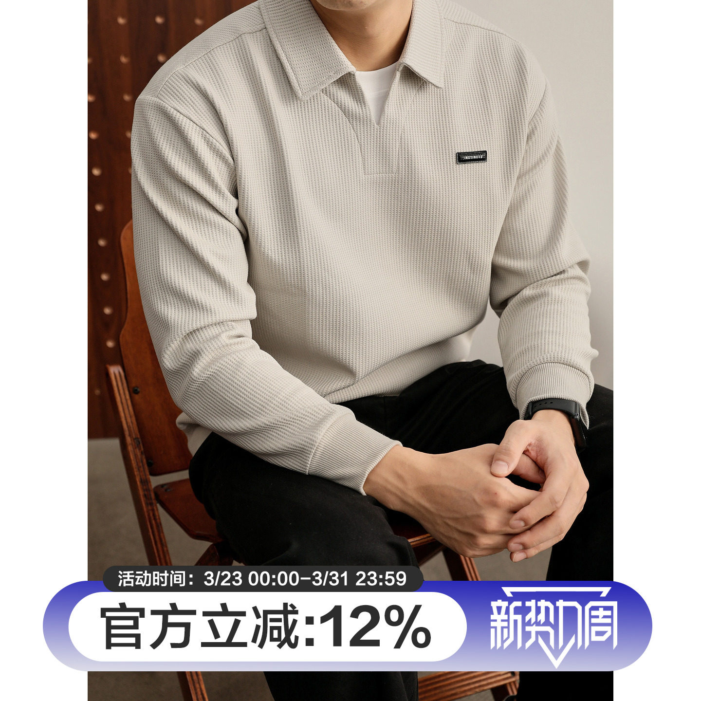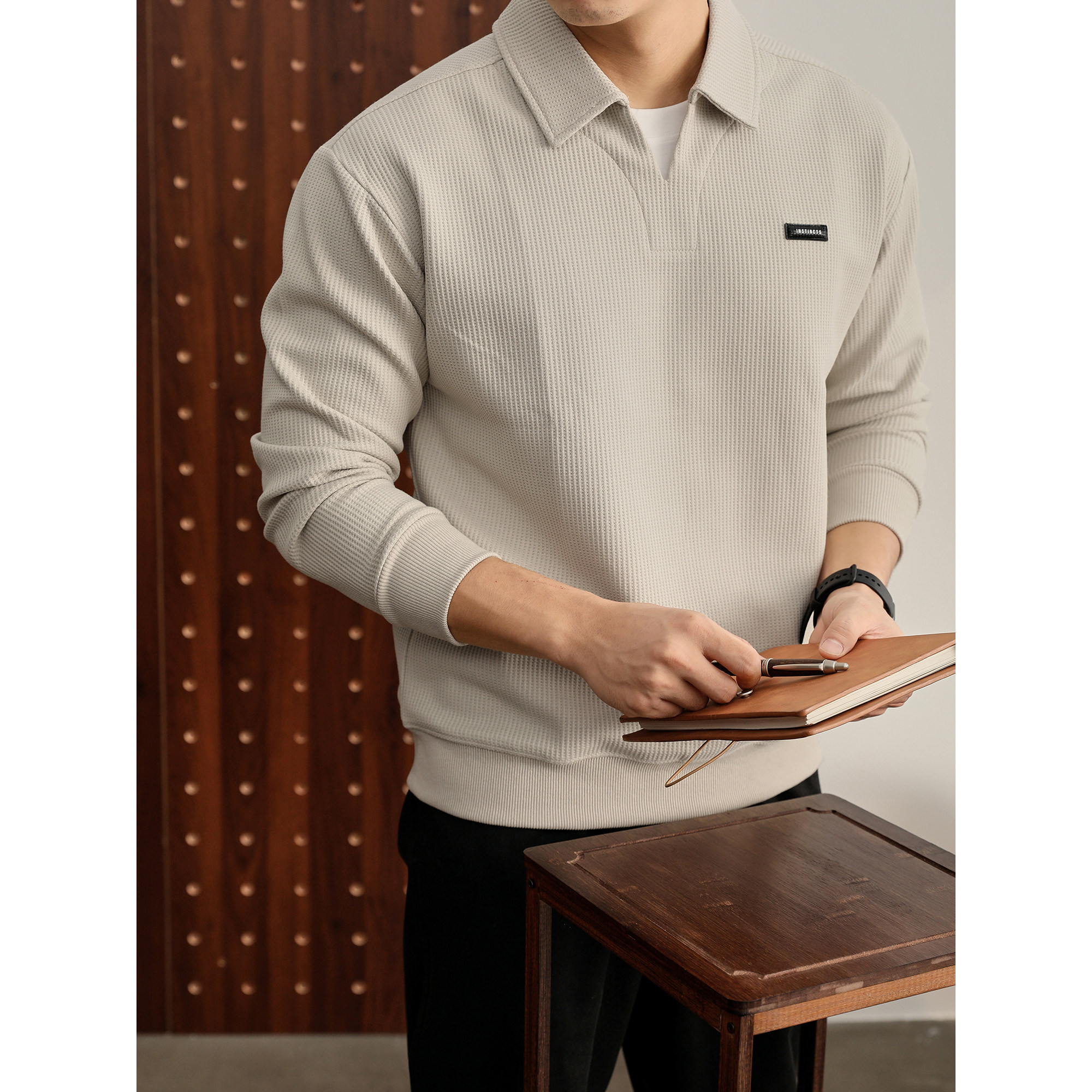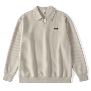 小皮标双层领口假两件卫衣 T恤男士 LUUD 儒雅杏色华夫格肌理感长袖