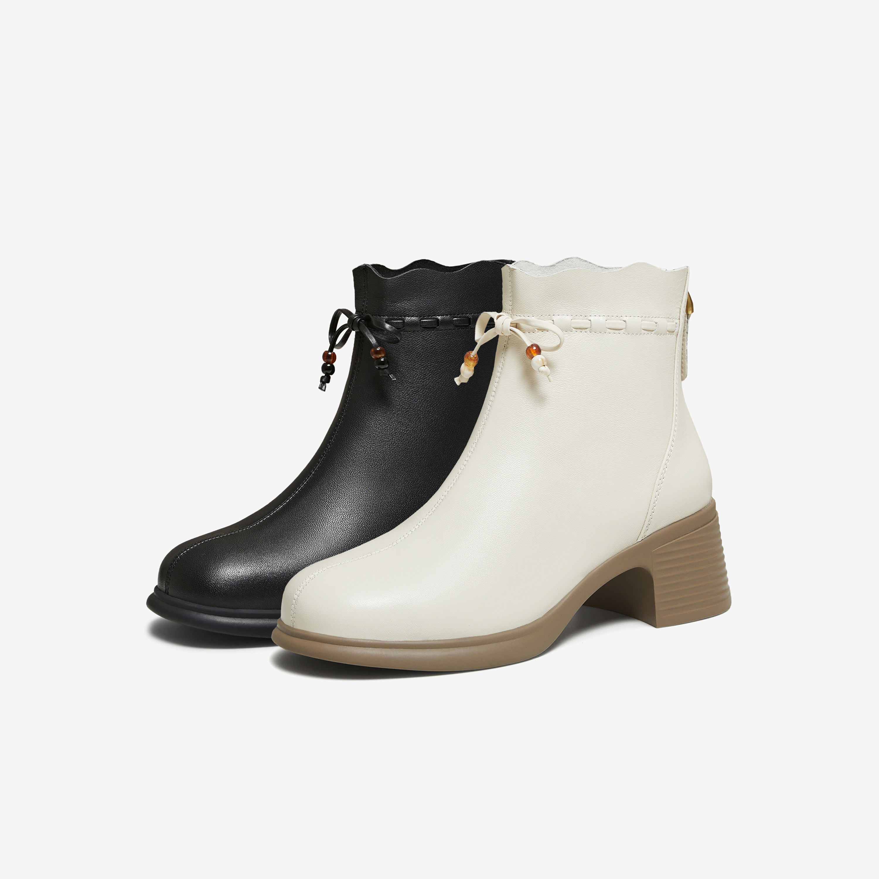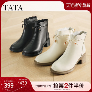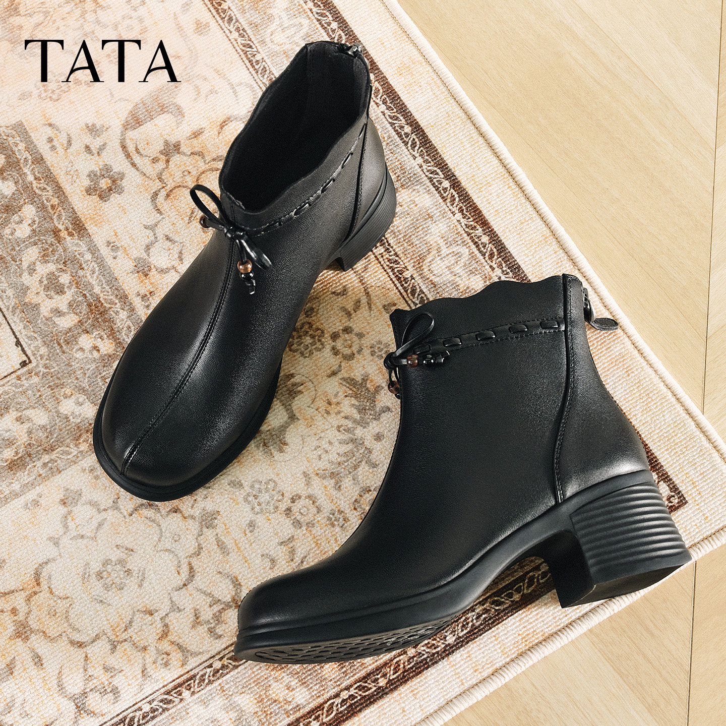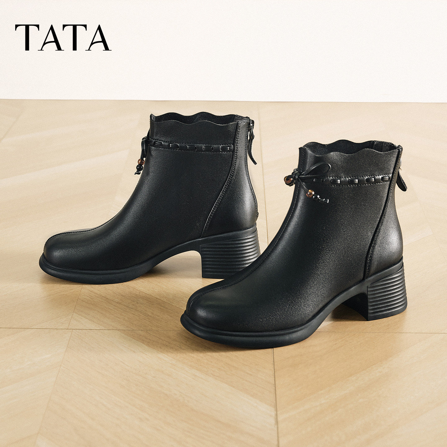 TATA他她靴子2025冬羊皮时装 靴加绒短皮靴黑色厚底瘦瘦靴7A540DD5