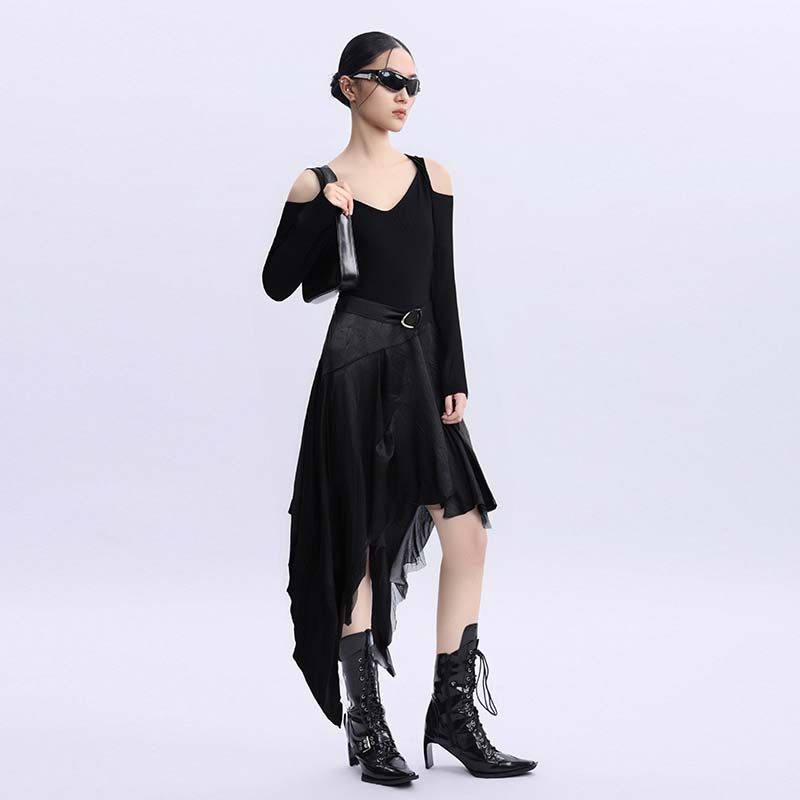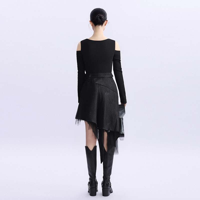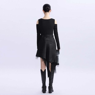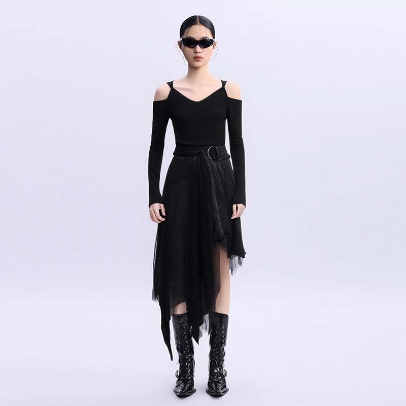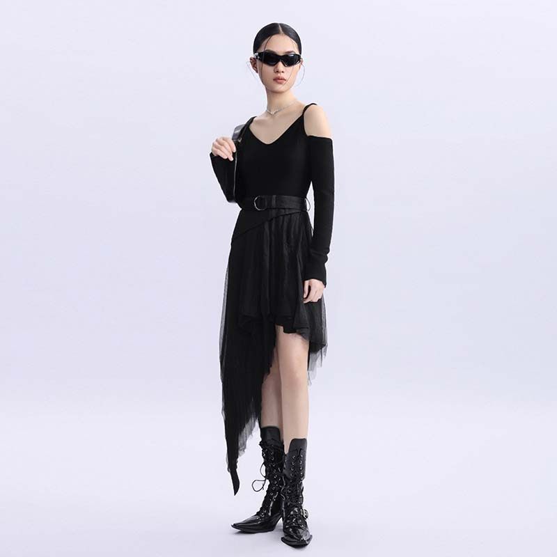 V领不规则连衣裙黑色针织莫代尔拼接蕾丝收腰长裙设计感露肩a字裙