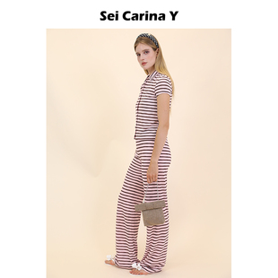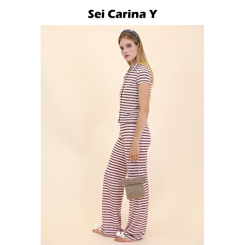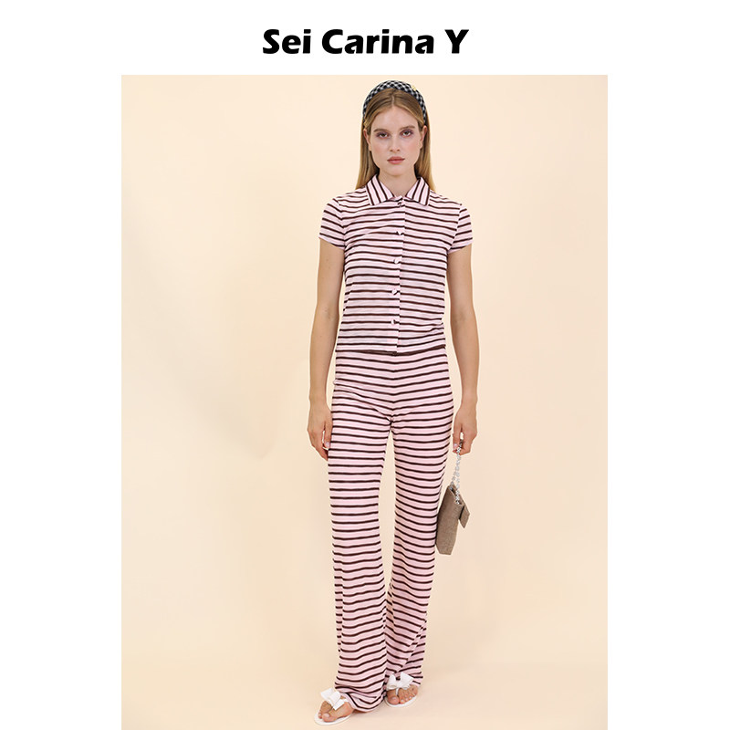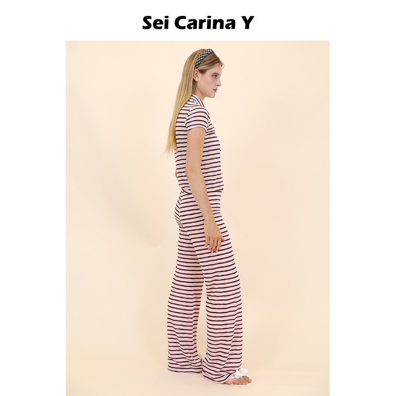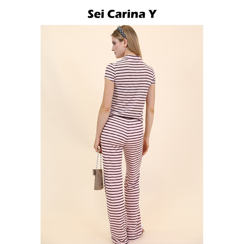 短袖 上衣女长裤 裤 Carina 子 秋冬新款 Y条纹开衫 百搭修身 Sei 套装