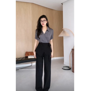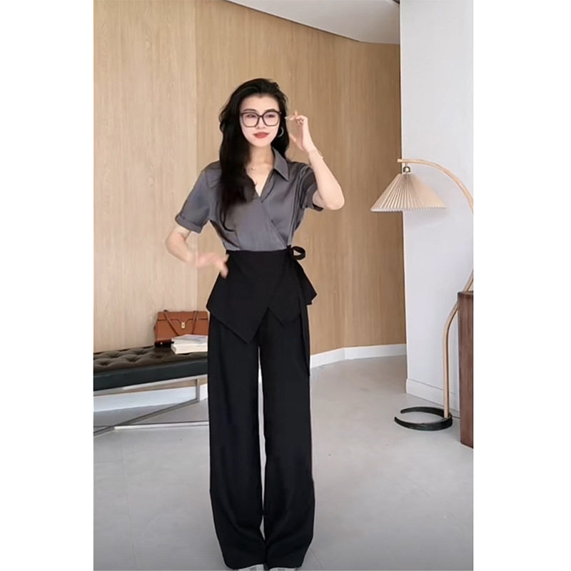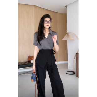 时尚 领阔腿裤 套装 胖mm灰色拼接上衣衬衫 两件套2599 女韩版 大码