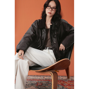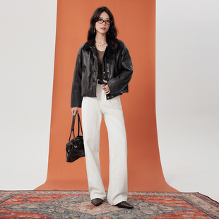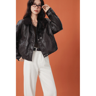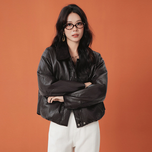 新款 百家好亮面皮质羽绒服女冬季 翻领撞色鹅绒短外套 House Basic