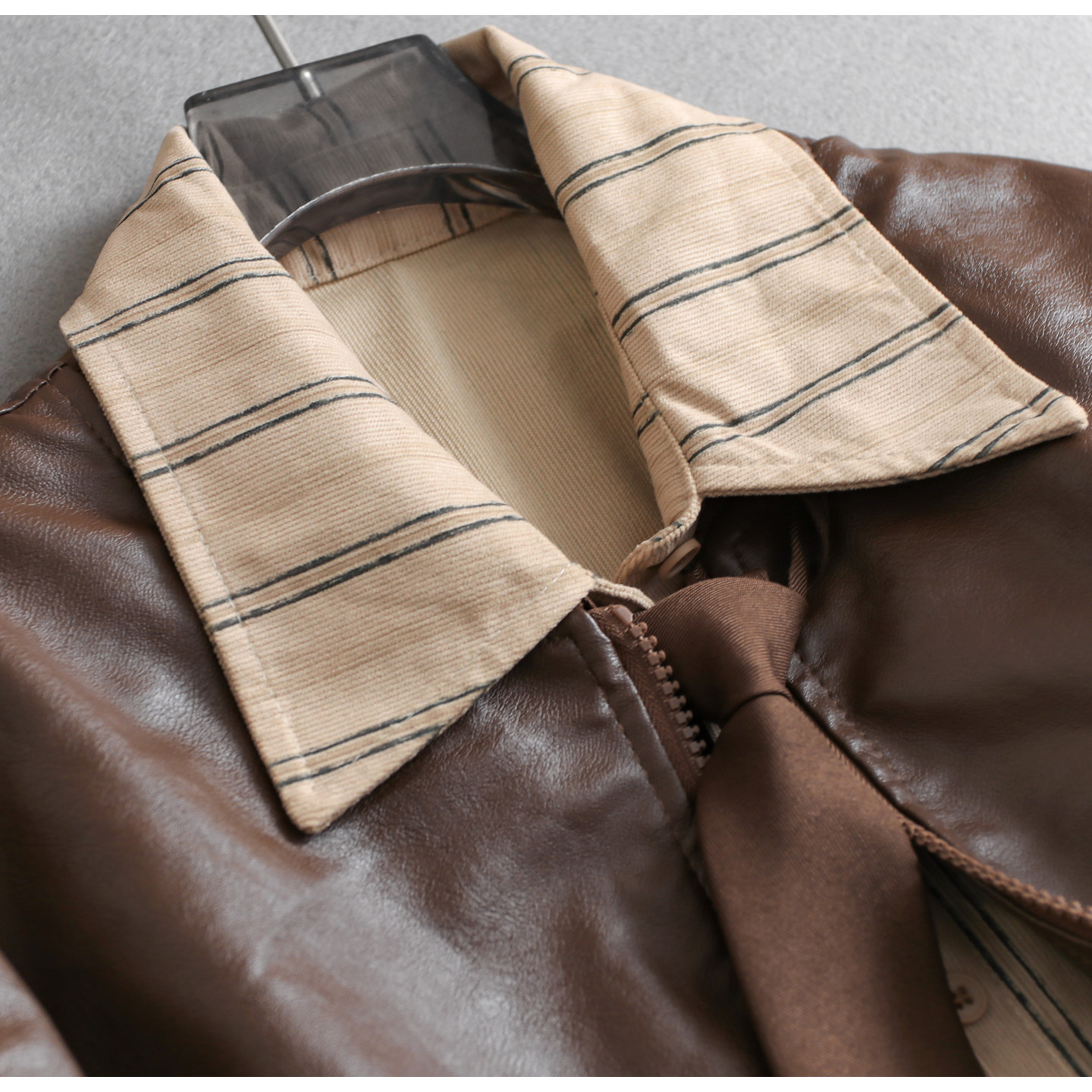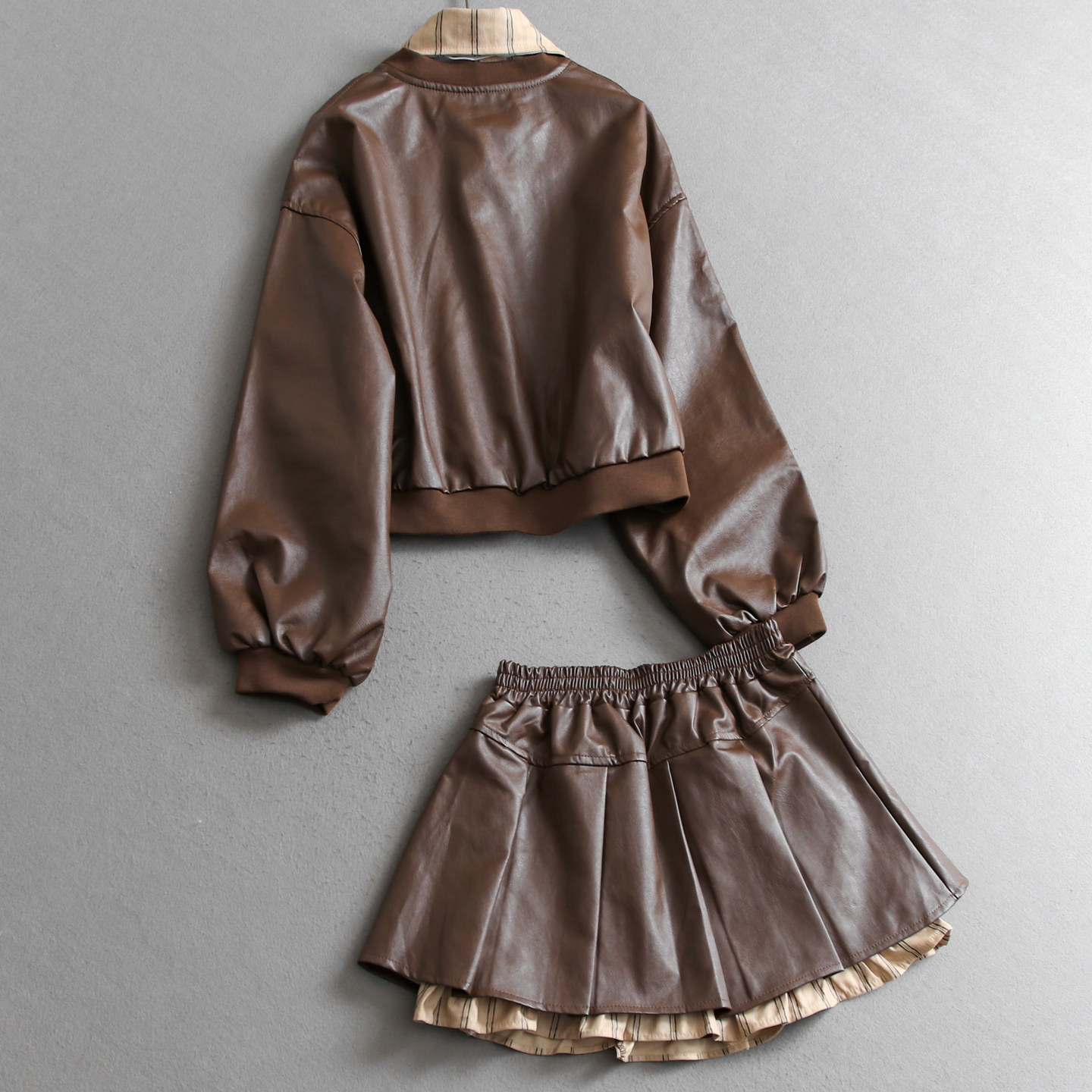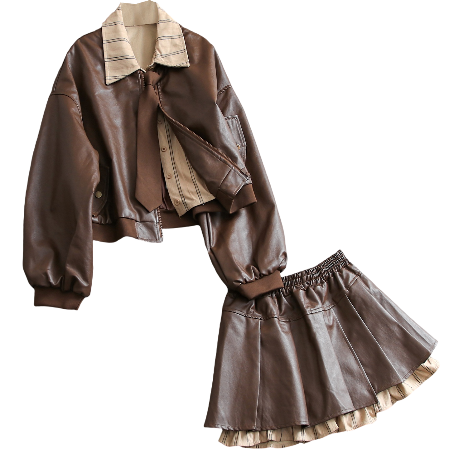 设计感小个子假两件领带皮衣外套一整套穿搭百褶短皮裙女套装 B025