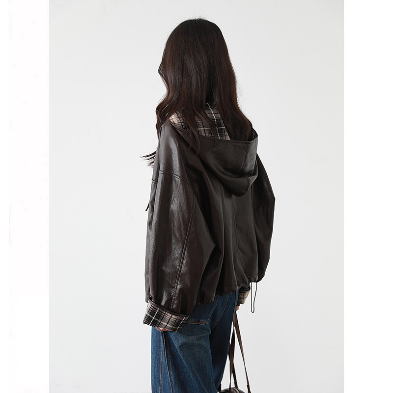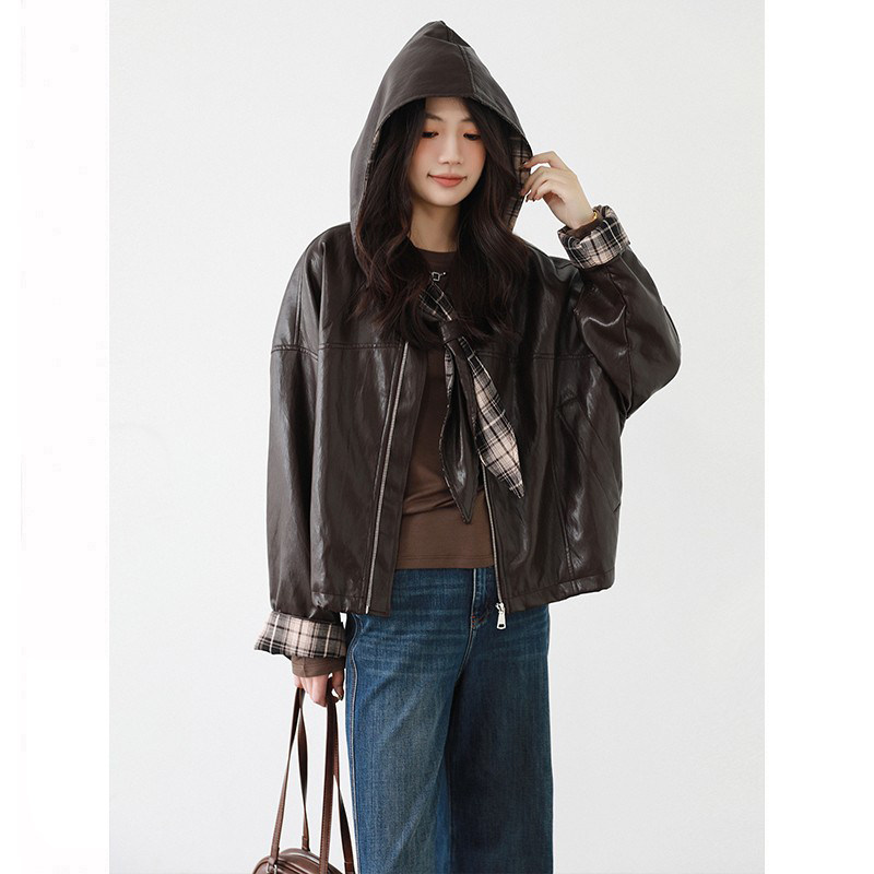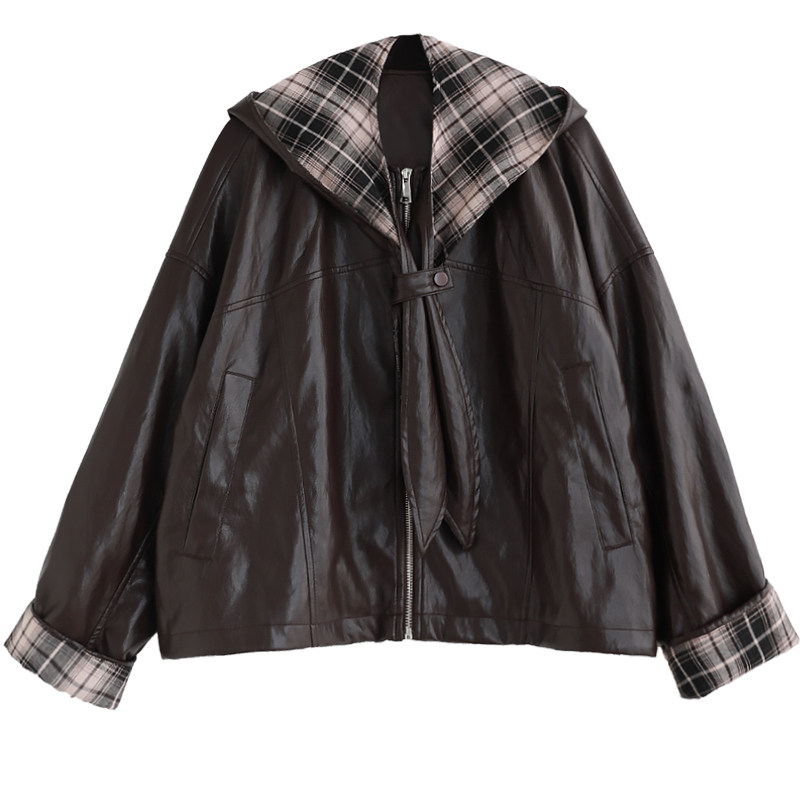 可拆卸领结帽 宽松百搭 软糯蛋白皮拼接格纹皮衣外套秋季