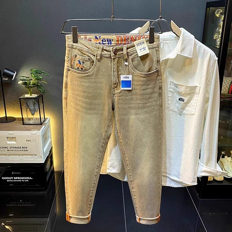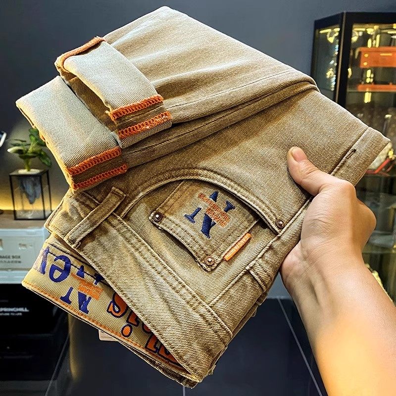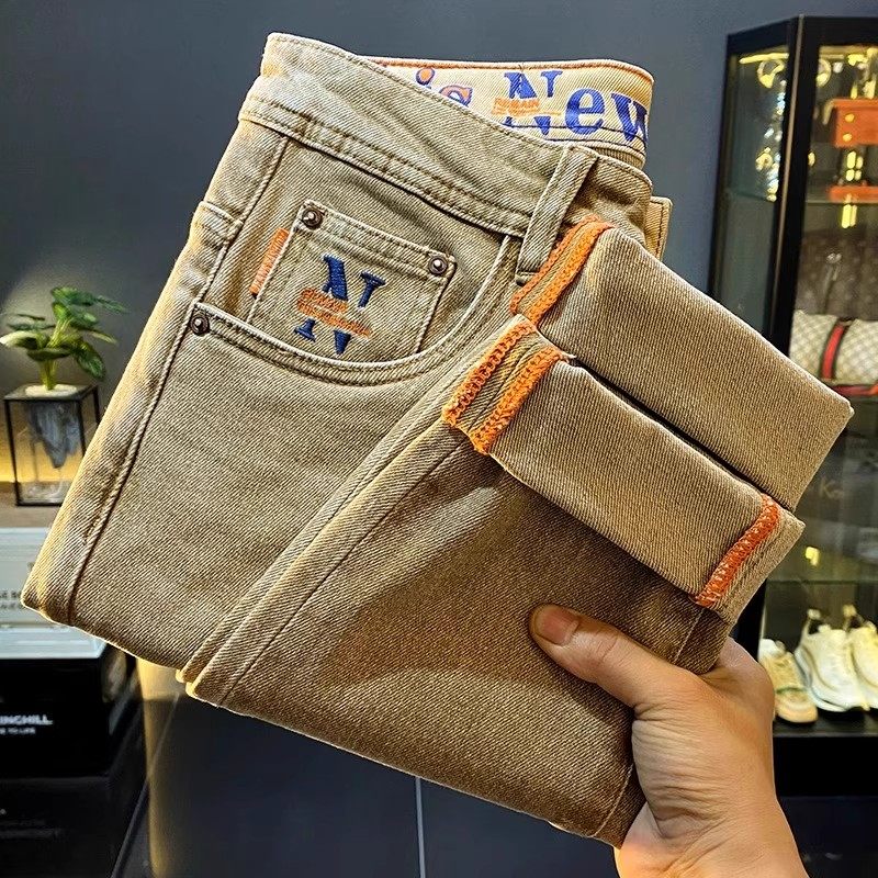 2025新款 春秋季 美式 潮牌高端修身 子 卡其色牛仔裤 小脚休闲长裤 男士